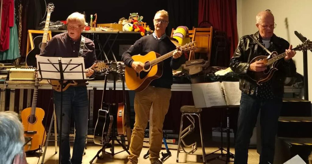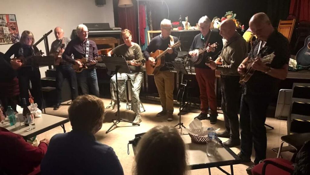 It is run it a bit like a “sit-and-listen” folk club but the music is anything playable and singable live, or just anything goes!
