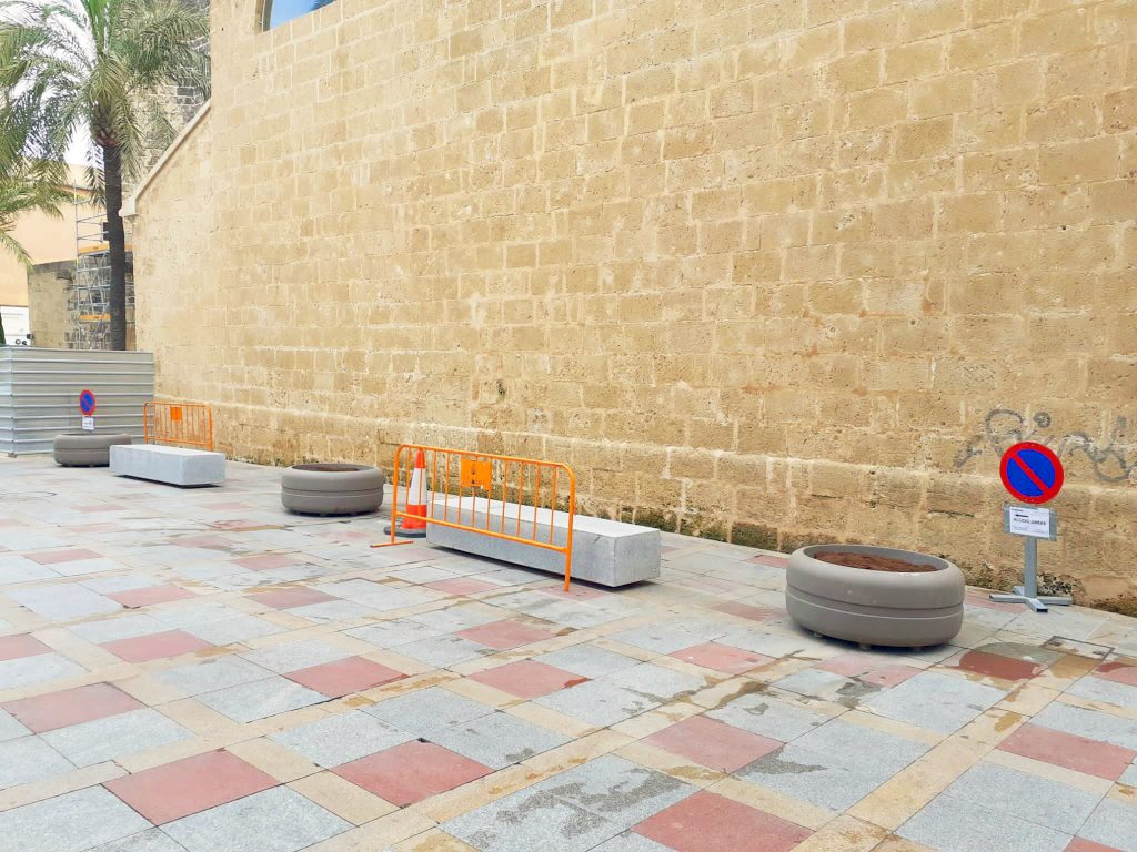 Although the final action to pedestrianize this enclave of the historic centre has not yet been defined, for the moment, the parking spaces in the southwest area of the square, parallel to the Communion Chapel and the entrance to the Plaça de l’Esglèsia have been removed. In their place, benches have been installed like the ones that already existed around the playground and the bank as well as large flower pots. Along the rest of the northern facade of the church is the security fence for the renovation work that already occupies several common parking areas and these, in all probability, will be removed once the actions on this part of the church are finished.