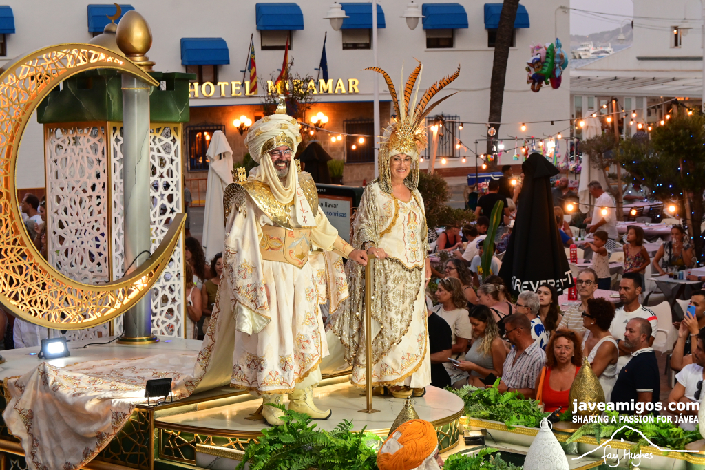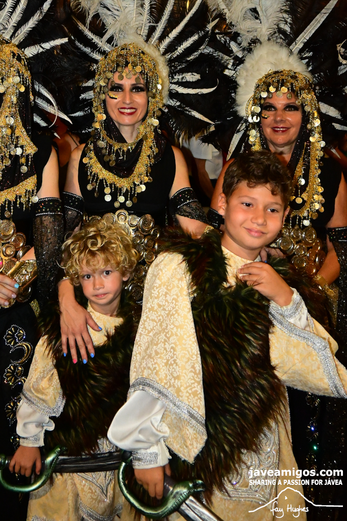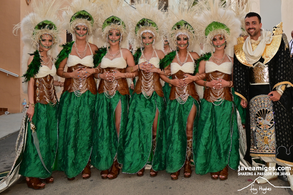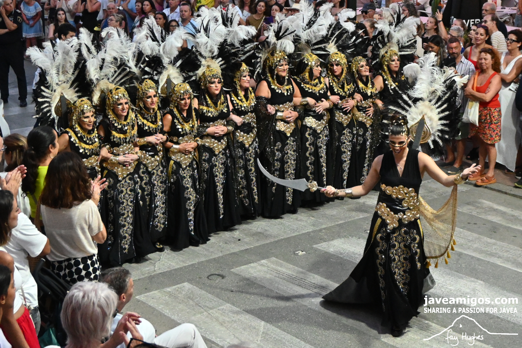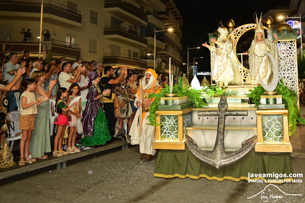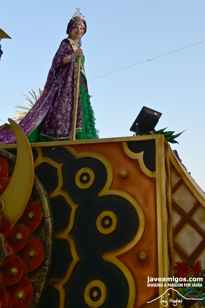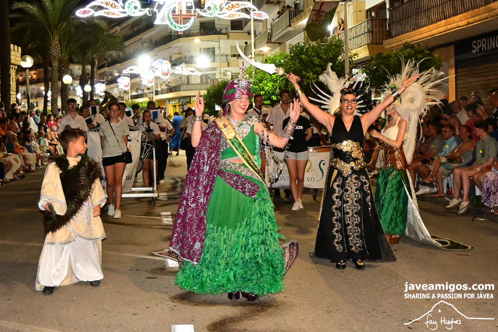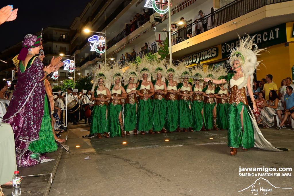 The rest of the parade happened according to the planned order. The filaes moved quickly to maintain a good rhythm that did not cause large separations between the different music bands. Vanessa Garrido, the Christian standard bearer, started punctually at 7.00pm on the back of a two-headed dragon and greeting the large audience that applauded her passage. Trabuquers, Contrabandistes, Bandoleres, Ballesters, Pirates de Sant Jaume and Faciners paraded behind her. Lucía Serrano, Mora standard bearer, led the Moorish troops, receiving the warmth of the crowd on an Arab carriage. The Filaes Xibia, Touaregs, Almoriscos, Almoradins, Al-Tarik’s and Schaitans followed behind.