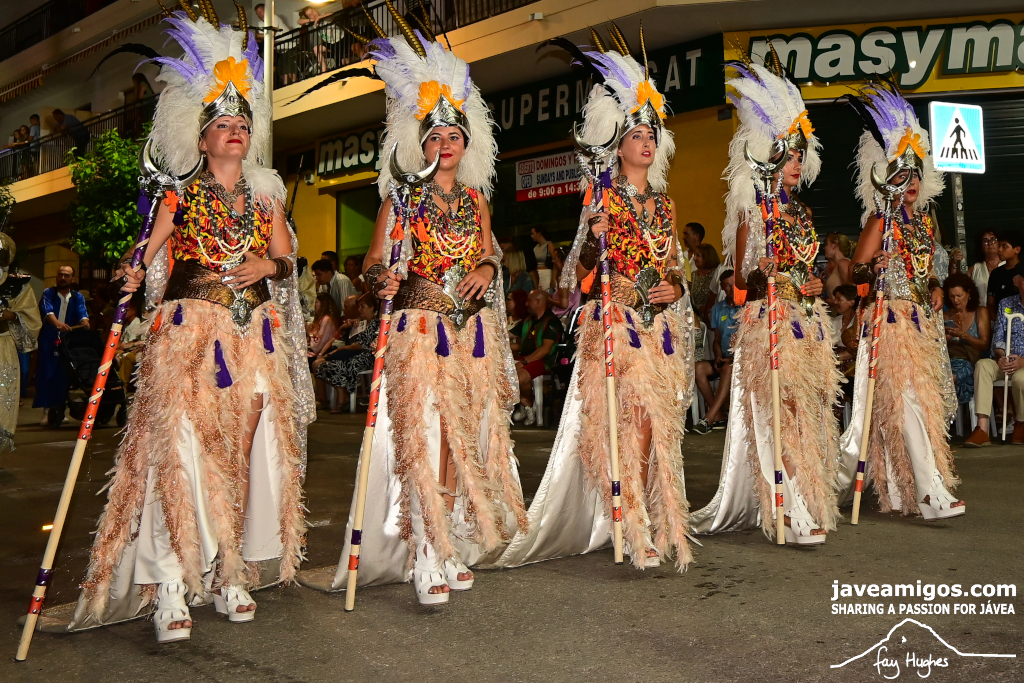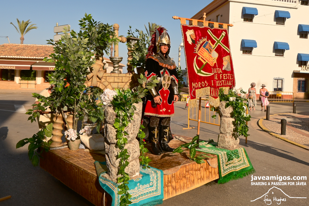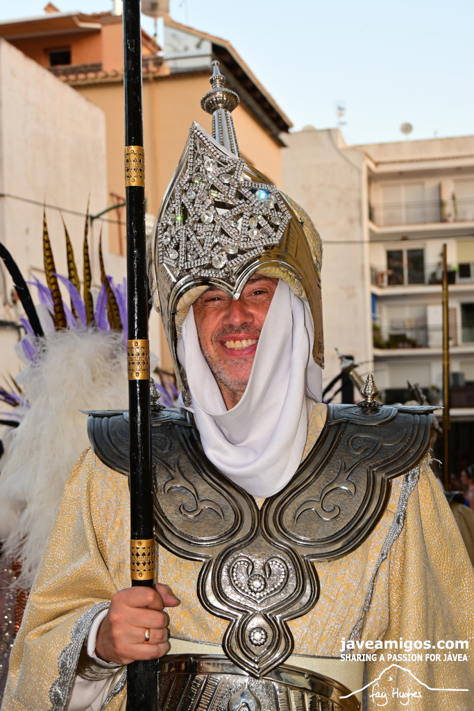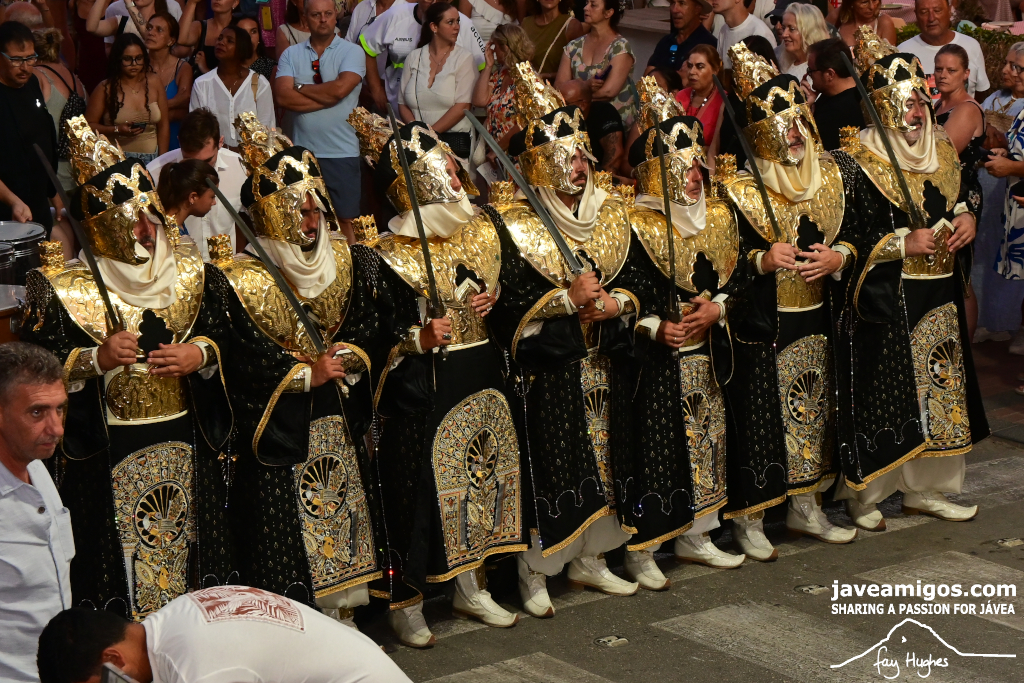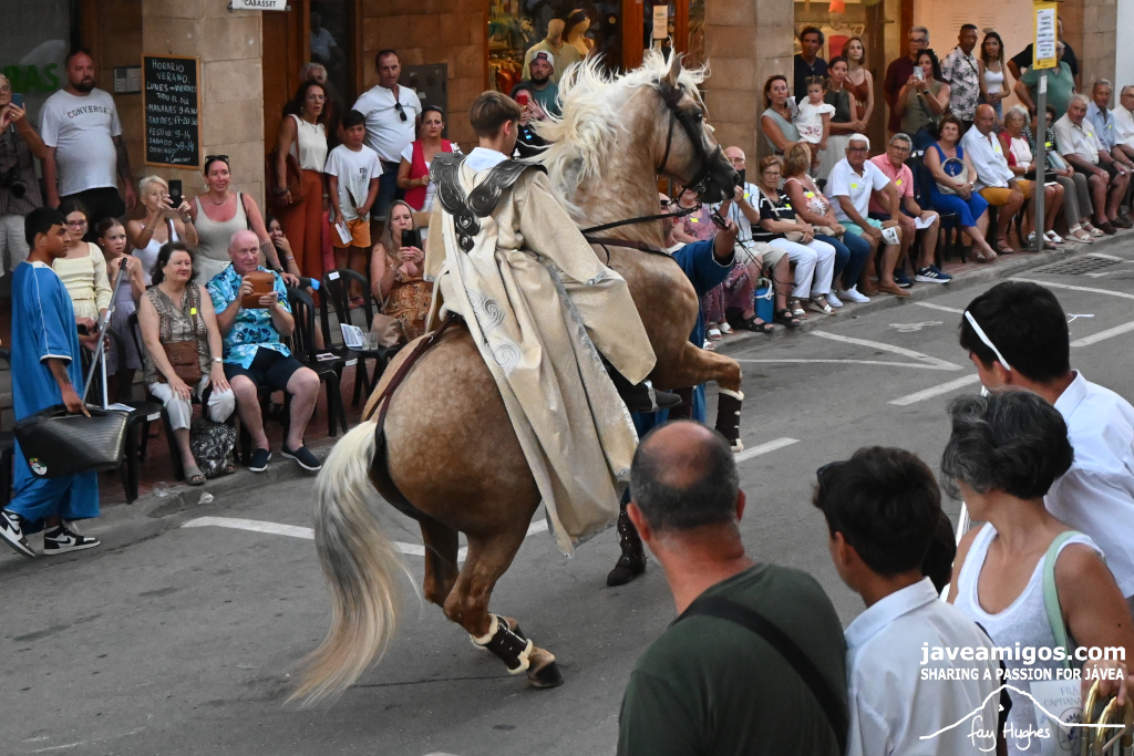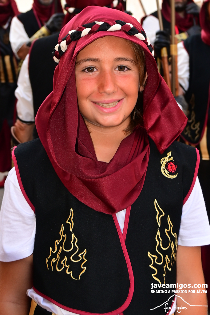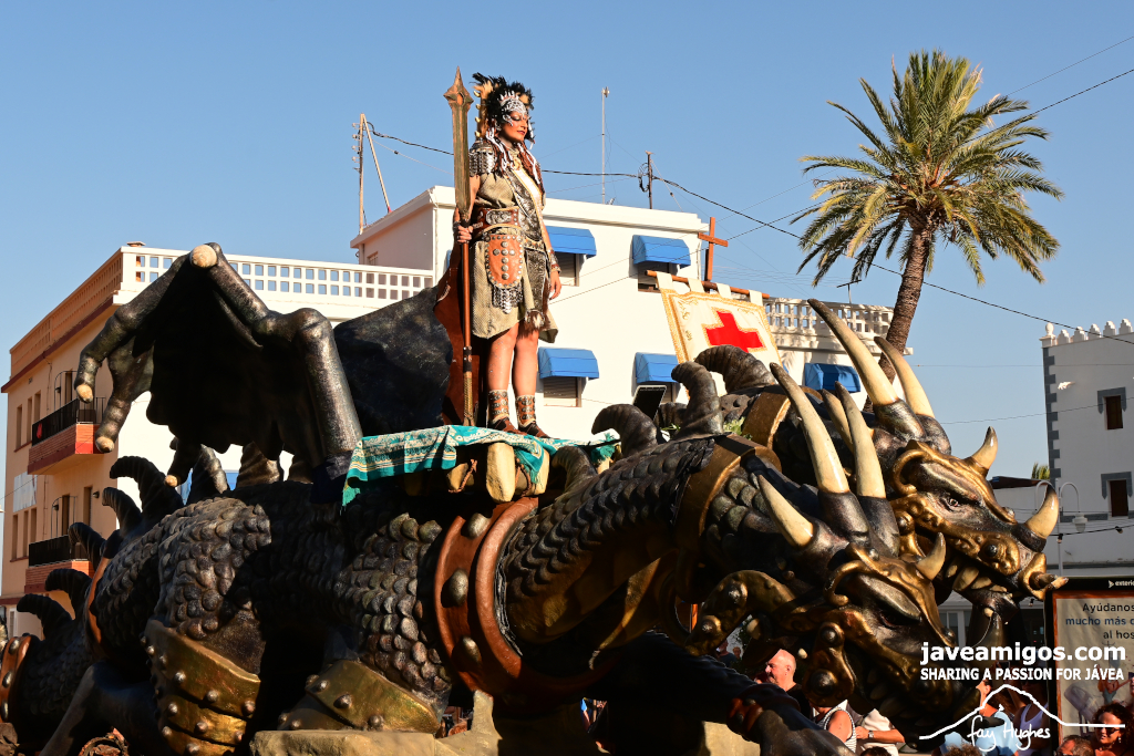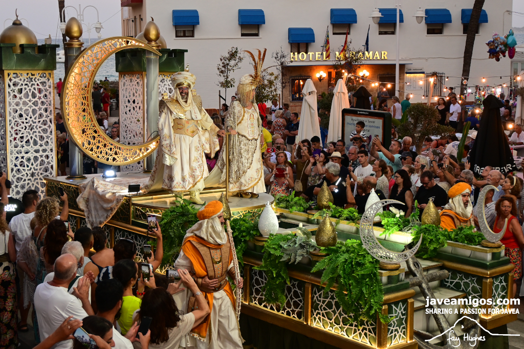 The rest of the parade happened according to the planned order. The filaes moved quickly to maintain a good rhythm that did not cause large separations between the different music bands. Vanessa Garrido, the Christian standard bearer, started punctually at 7.00pm on the back of a two-headed dragon and greeting the large audience that applauded her passage. Trabuquers, Contrabandistes, Bandoleres, Ballesters, Pirates de Sant Jaume and Faciners paraded behind her. Lucía Serrano, Mora standard bearer, led the Moorish troops, receiving the warmth of the crowd on an Arab carriage. The Filaes Xibia, Touaregs, Almoriscos, Almoradins, Al-Tarik’s and Schaitans followed behind.