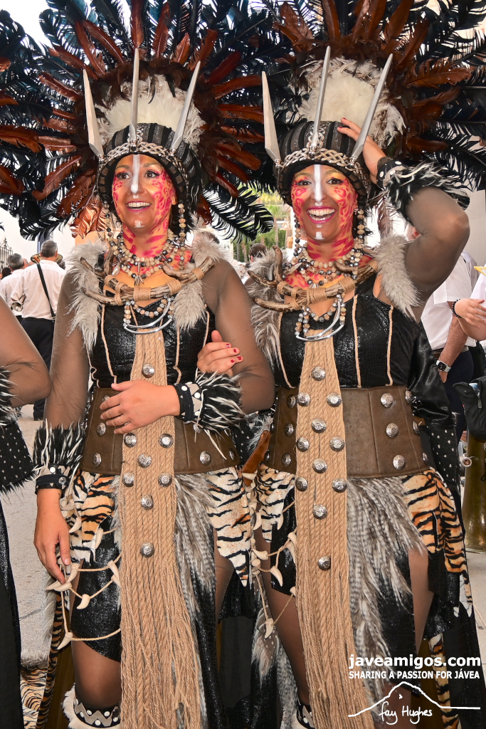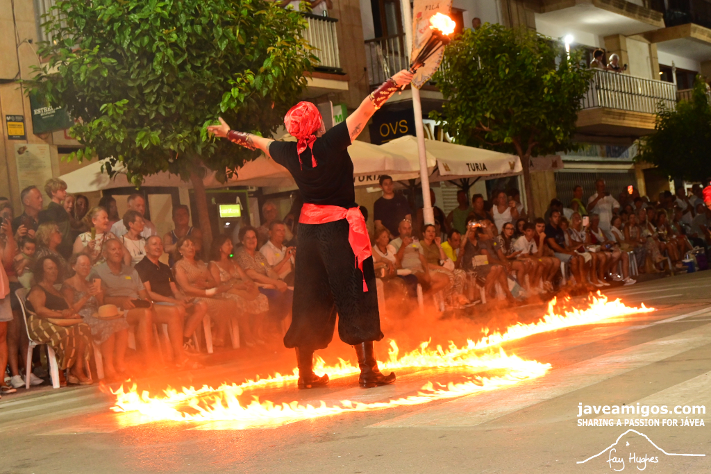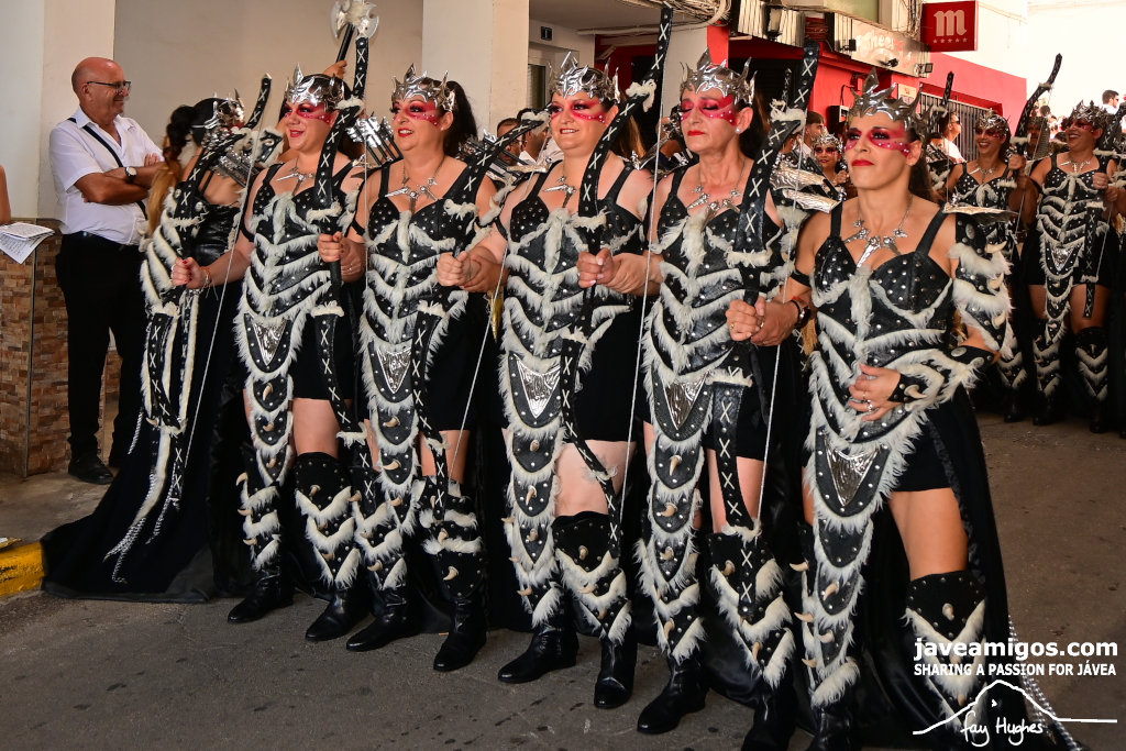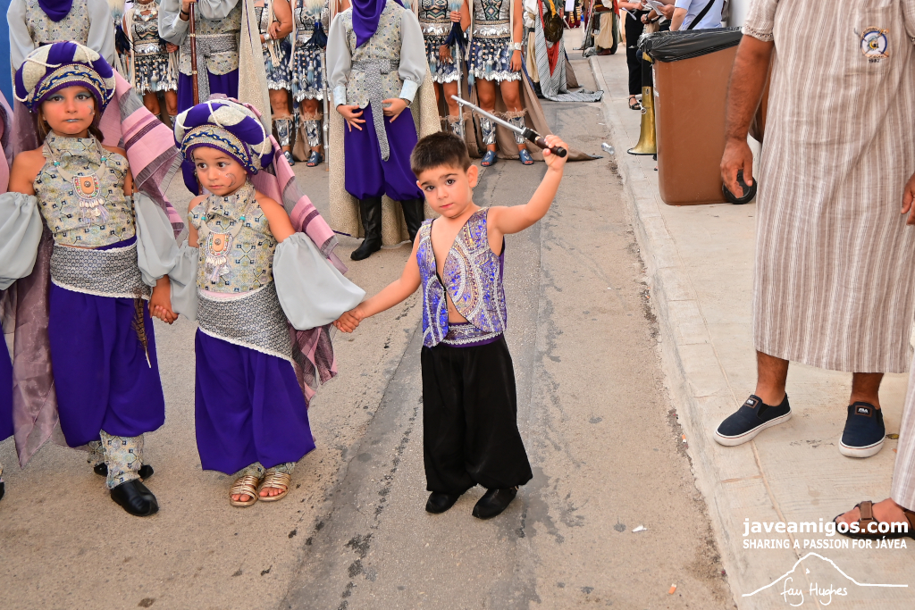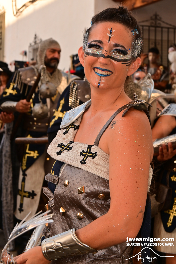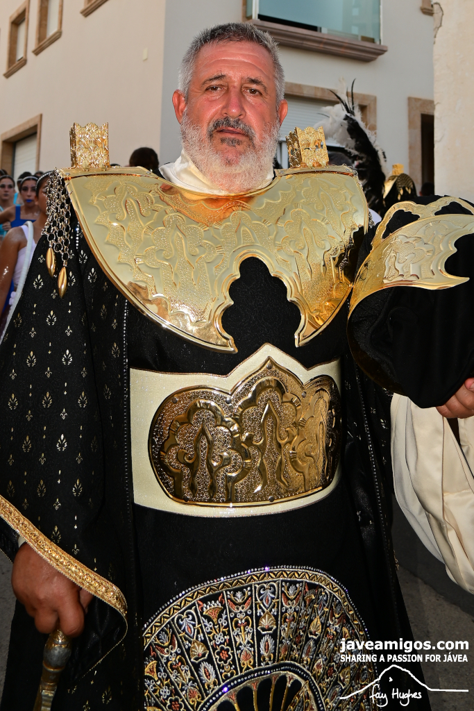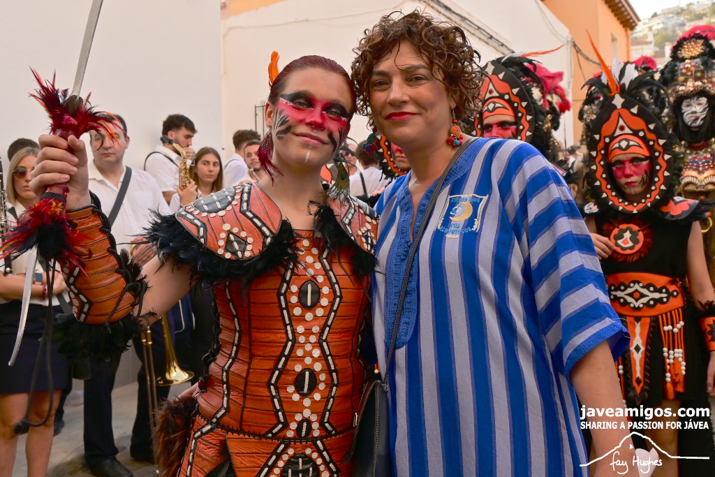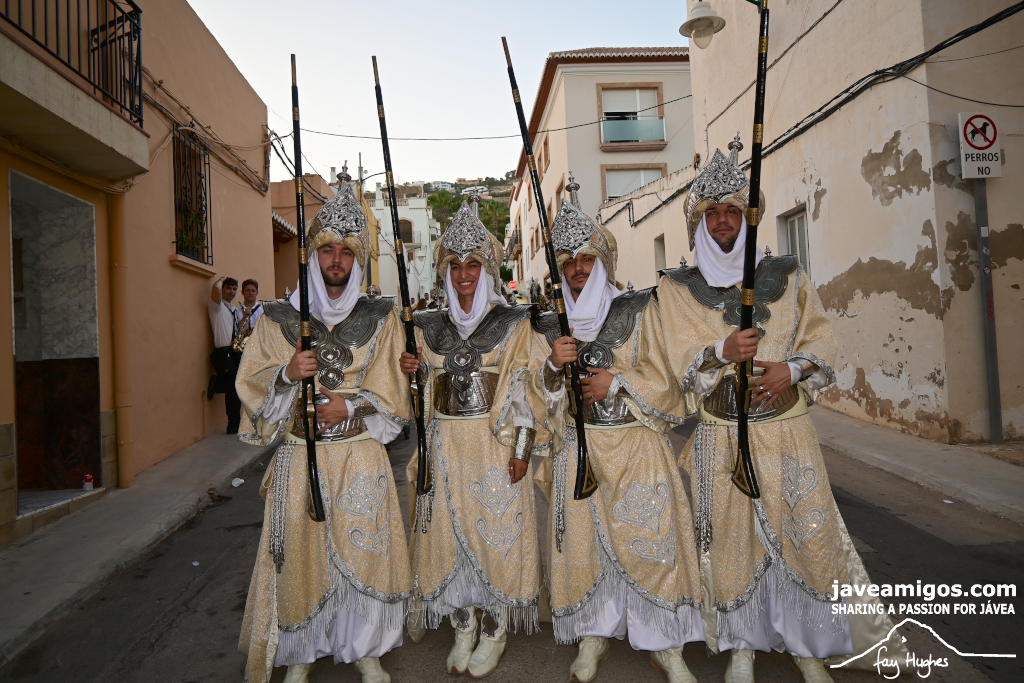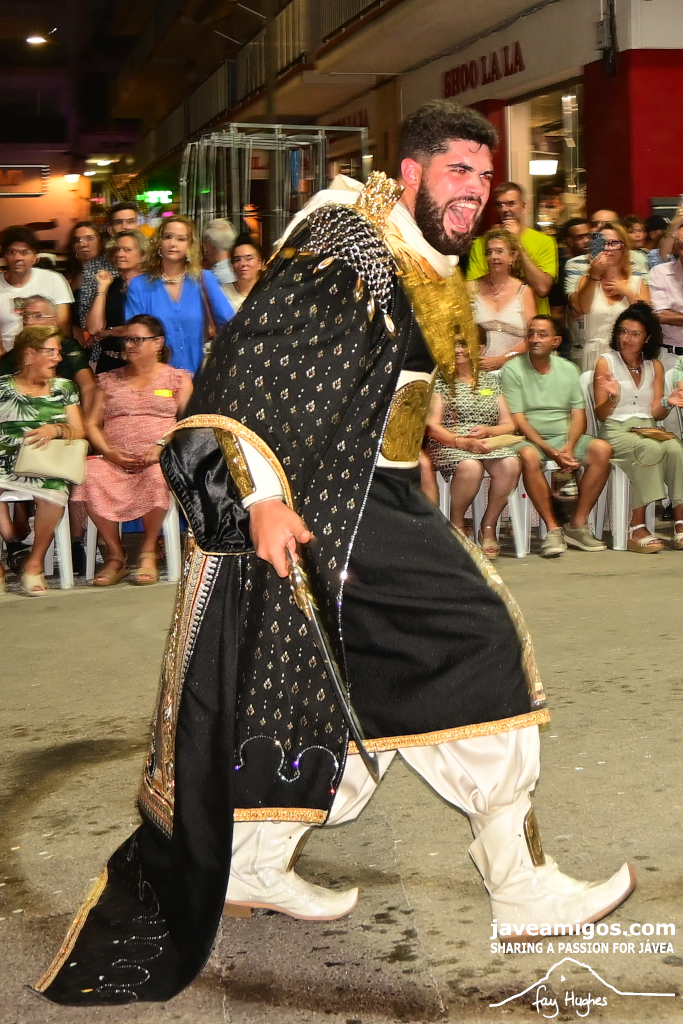 The rest of the parade happened according to the planned order. The filaes moved quickly to maintain a good rhythm that did not cause large separations between the different music bands. Vanessa Garrido, the Christian standard bearer, started punctually at 7.00pm on the back of a two-headed dragon and greeting the large audience that applauded her passage. Trabuquers, Contrabandistes, Bandoleres, Ballesters, Pirates de Sant Jaume and Faciners paraded behind her. Lucía Serrano, Mora standard bearer, led the Moorish troops, receiving the warmth of the crowd on an Arab carriage. The Filaes Xibia, Touaregs, Almoriscos, Almoradins, Al-Tarik’s and Schaitans followed behind.