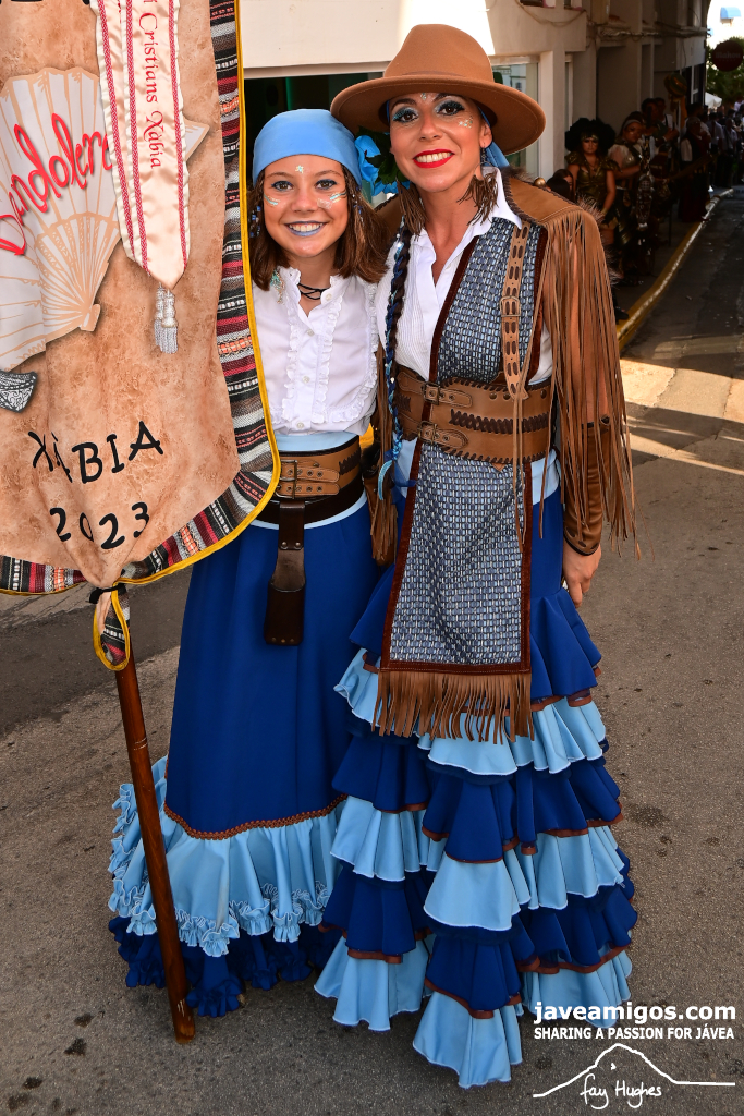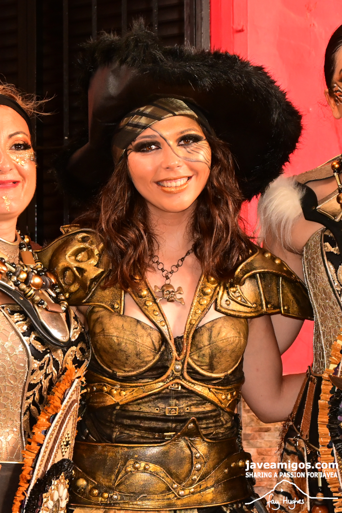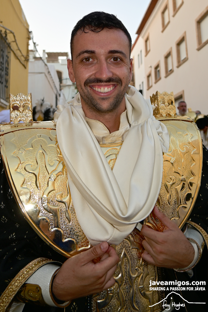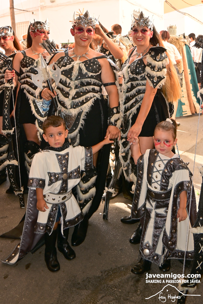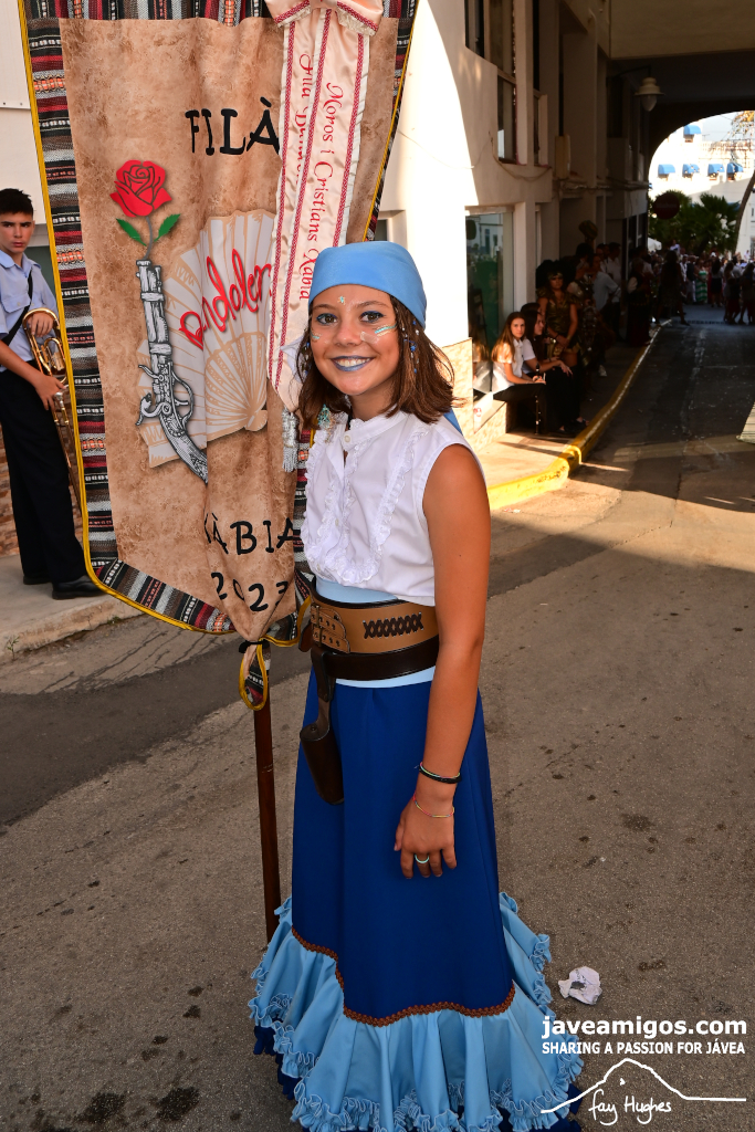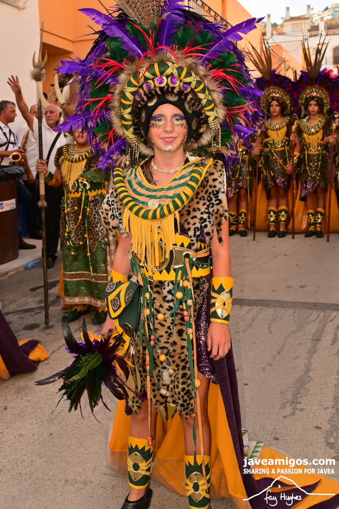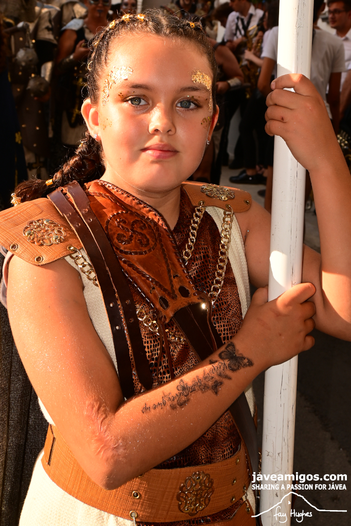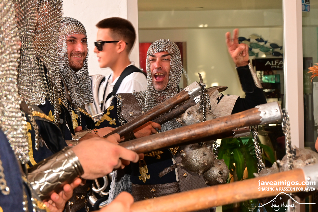 The rest of the parade happened according to the planned order. The filaes moved quickly to maintain a good rhythm that did not cause large separations between the different music bands. Vanessa Garrido, the Christian standard bearer, started punctually at 7.00pm on the back of a two-headed dragon and greeting the large audience that applauded her passage. Trabuquers, Contrabandistes, Bandoleres, Ballesters, Pirates de Sant Jaume and Faciners paraded behind her. Lucía Serrano, Mora standard bearer, led the Moorish troops, receiving the warmth of the crowd on an Arab carriage. The Filaes Xibia, Touaregs, Almoriscos, Almoradins, Al-Tarik’s and Schaitans followed behind.