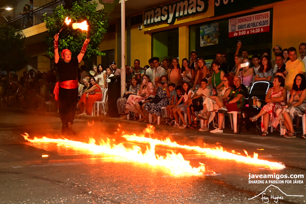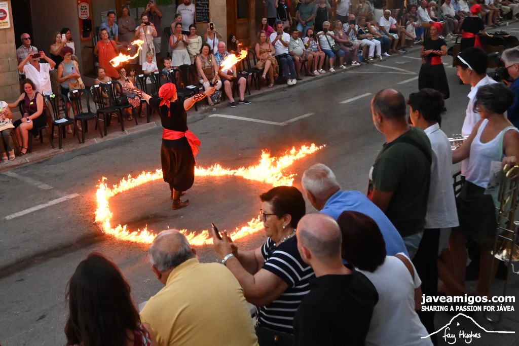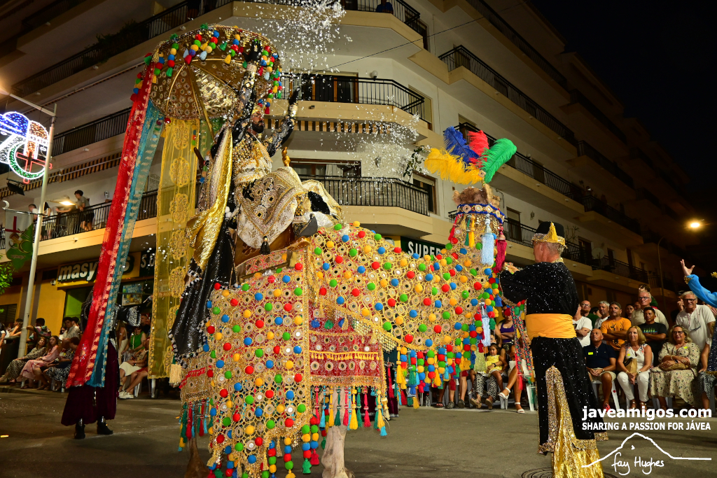The pageantry changed tone to recreate a great bazaar rich in colours, flavors and, of course, aromas with incense, spices and perfumes intoxicating with their exotic fragrance that clouded the senses and a small souk full of eye-catching exotic objects and authentic steaming tajine. Next, a court of dancers announced the arrival of their lords in front of another beautiful camel carefully decorated for the occasion. After the ballet, a path of fire, which drew arabesque motifs on the ground, illuminated the path of the top representatives of the Filà BAHARIS who made an appearance on top of a intricately designed float. Bengoa and Arrausi received applause from the entire public along the route and the affection of the rest of the festeros.
