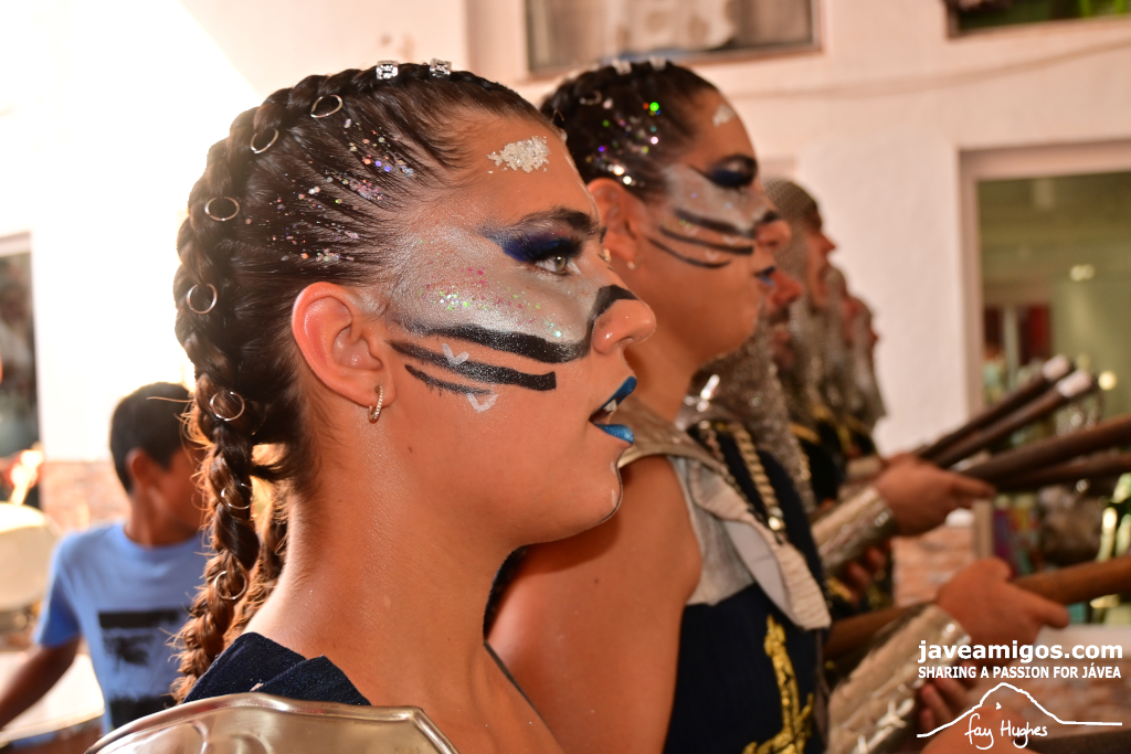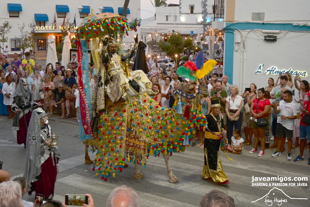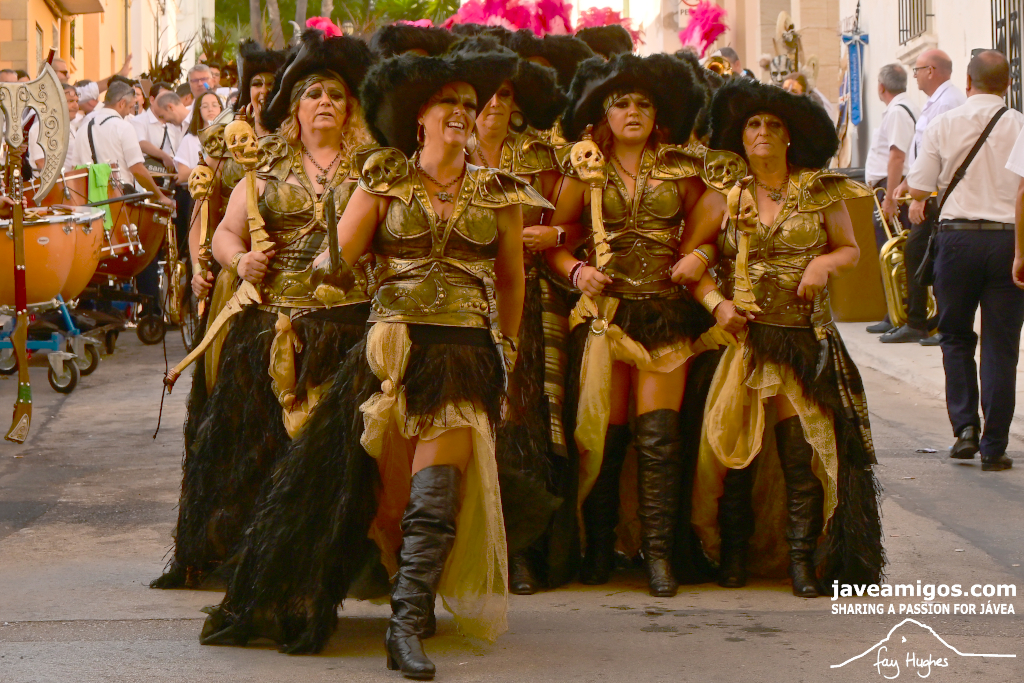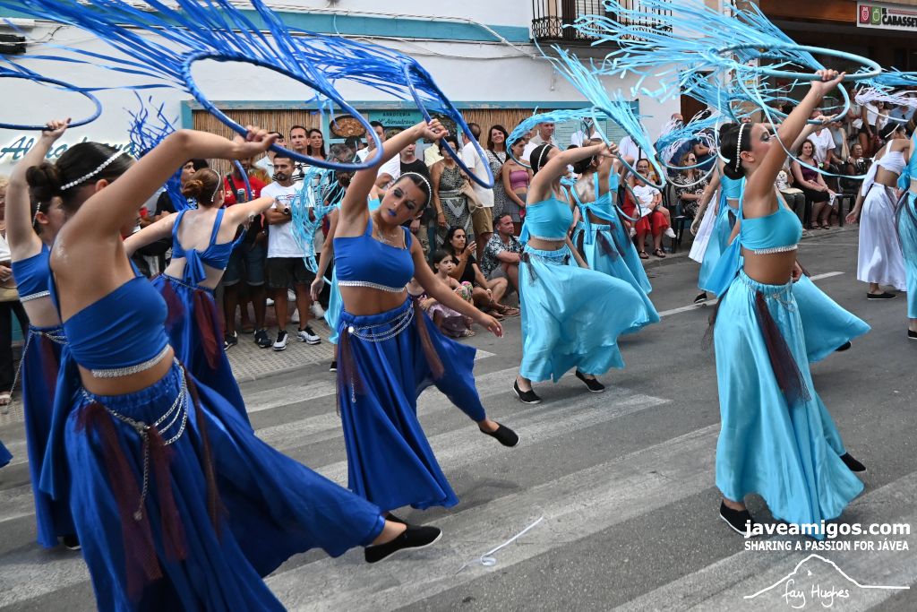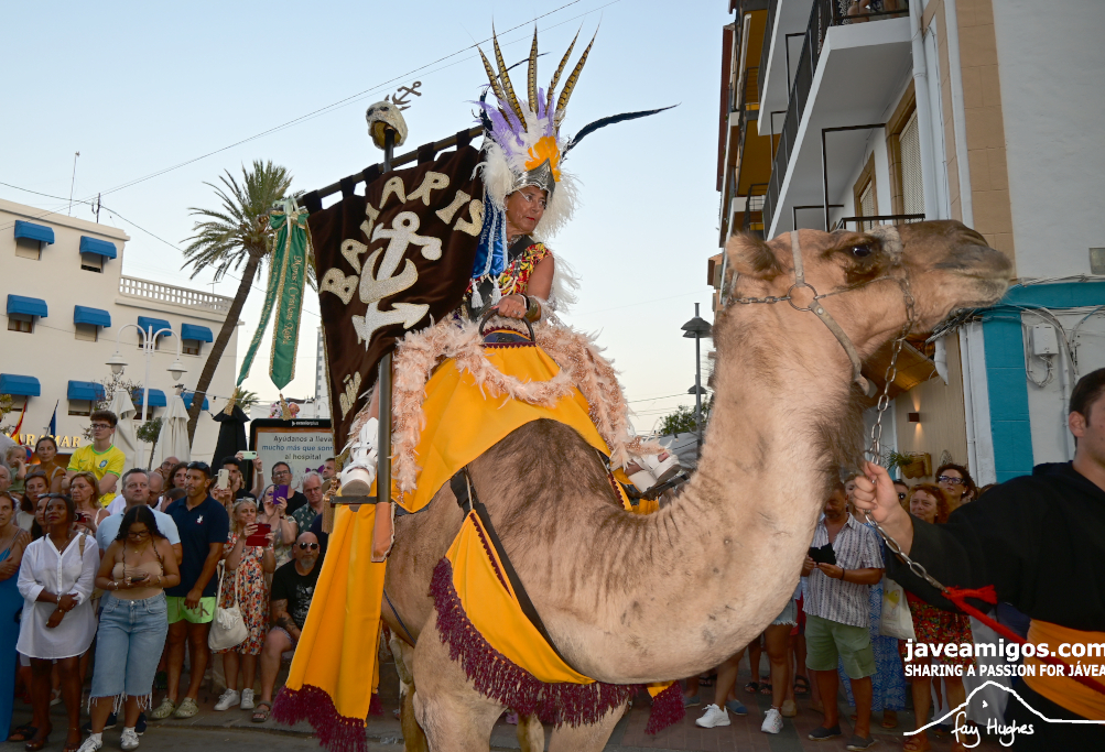 After the last filà mora passed, the great banner of the red-eyed skull of the BAHARIS appeared carried on the back of a camel. Behind it, the talented dancers from Endanza de Xàbia dance academy reminded us of the roots of Filà BAHARIS, founded by a group of Xàbia’s sailors in 1986 and whose name means “sailors” in Arabic.