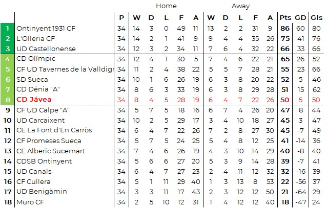 At the time of writing, the promotion play-offs are being contested with the top three teams having mixed success, the shock of the first leg of the semi-finals being the 0-3 defeat of champions Ontinyent 1931 CF at CF Recambios Colon, who finished third in Group II. UD Castellonense drew 1-1 at home to Group I champions CD Soneja whilst CF L’Olleria drew 0-0 at home with Group I runners-up CD Burriana.