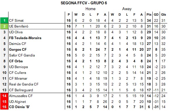 Gorgos CF recorded their fourth successive victory after a 2-1 home win over Daimús CF and have now gone seven games undefeated but remain in 6th spot. CF Orba move into 8th after a 1-0 away win at struggling UD Alginet.
