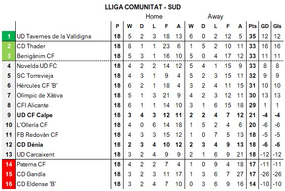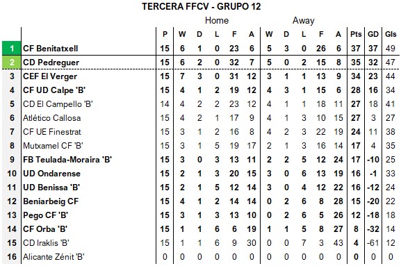 The bottom three remains unchanged, although Paterna’s win lifts them above CF Gandía and CD Eldense “B”, whose draw at Calpe reduces the gap to four points from safety.