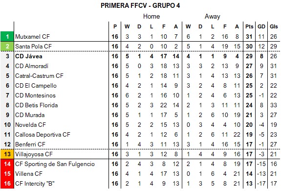 At the bottom, Almussafes CF drop into the relegation zone after losing a “six-pointer” with CF Bellreguard who climb out of the danger zone as a result. Both UD Alginet and CD Dénia “B” remain well adrift of safety.