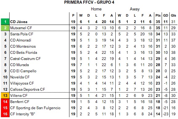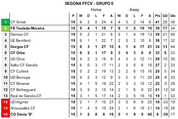 FB Teulada-Moraira move into second spot after a 4-0 away win at bottom three club Almussafes CF, the club’s fifth successive game without defeat on the road. Gorgos CF are just four points behind after a 2-0 win at UD Beniopa, extending their unbeaten run to 10 games, the last defeat being to FB Teulada-Moraira back in November. CF Orba came back from a 0-1 half-time deficit to score two late goals to keep in touch with the chasing pack and extend their own run to three games without defeat. At the bottom, CD Dénia “B” crashed 3-0 away at third-placed Daimús CF, their eleventh game in a row without a win, and they are now 13 points adrift of safety.