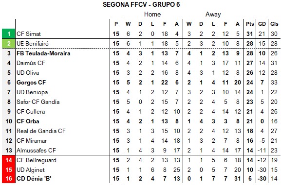 CD Simat open up a three-point lead at the top of the table after their 4-0 away win at Almussafes CF and FB Teulada-Moraira first home defeat of the season, a 2-3 reverse at the hand of Daimús CF, and the Marina Alta side drops into third spot, their place taken by UE Benifairó who beat Safor CF Gandía 1-0 at home.