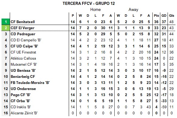CF Benitachell remain three points clear at the top of the table after a 5-0 away win over the reserve side of CD Orba, former CD Jávea players Rubén Ortolá and Pablo Irigoyen amongst the scorers. CEF El Verger stay in touch after a 3-1 home win over the reserve side of FB Teulada-Moraira whilst CD Pedreguer completes the Marina Alta 1-2-3 at the top after a 5-0 home win over Beniarbeig CF