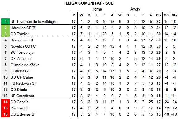 UD Tavernes return to the top of the table after a 1-0 victory at struggling Paterna CF and the away defeat of previous leaders CF Hércules “B” at UD Carcaixent. CD Thader move into third spot after a 3-0 win at bottom club CD Eldense “B”, moving above UD Benigànim on goal difference after the latter’s 2-0 away defeat at Olímpic de Xàtiva.