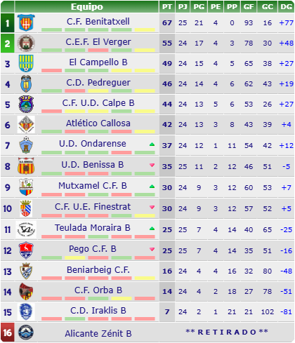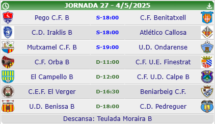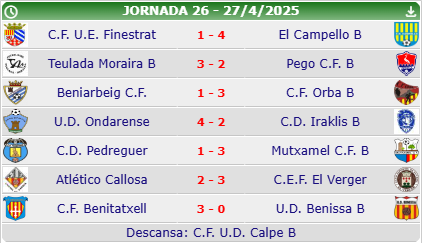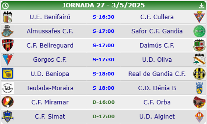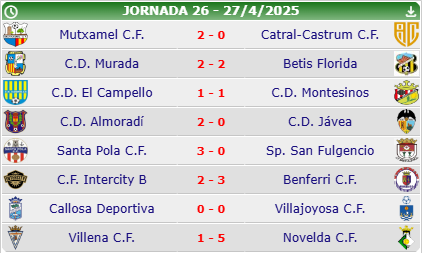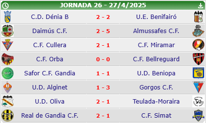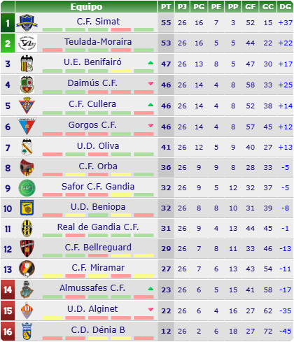 At the bottom CD Dénia ‘B’ are already relegated; UD Alginet slip to 15th after a home defeat to Gorgos CF whilst Almussafes CF’s second win in succession, an stunning 5-2 away victory at Daimús CF which more or less ends the latter’s hopes of promotion, lifting the club to within four points of safety. CF Miramar’s loss at CF Cullera keeps them in touch with the drop zone whilst CF Bellreguard’s 0-0 draw at CF Orba edges them away from the bottom three.