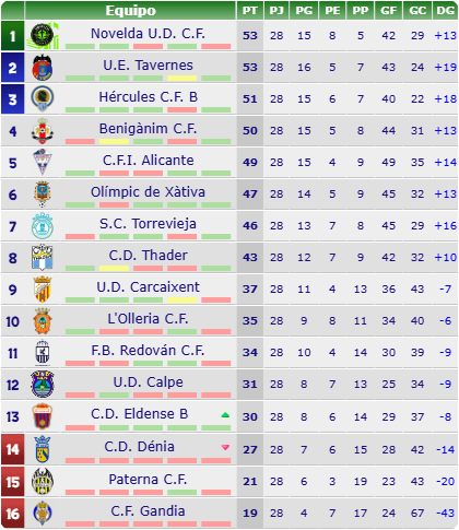 With two games of the regular season remaining, just four points separate the top five with Novelda UD CF holding top position – and the only automatic promotion spot – on the strength of a better head-head-to-head record against UD Tavernes, who remain in the promotion play-off zone alongside Hércules CF ‘B’. Next weekend, four of the top five meet – UE Tavernes vs UD Beniganim and Hércules CF ‘B’ vs Novelda UD CF – whilst CFI Alicante could slip right into the fight with a win at FB Redovan CF.