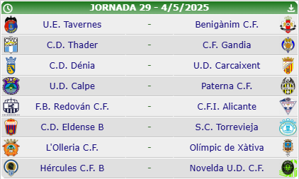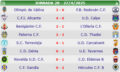 At the bottom, CF Gandia are relegated after a 0-2 home defeat to Hércules CF ‘B’, their fifth loss in a row, and a somewhat sad end to a season of uncertainty which started with the possibility that the club would not be able to register a team to compete in the Lliga Comunitat and would be “relegated” to the Tercera FFCV. They are joined by Paterna CF, the 2-3 home defeat to CD Thader confirming an immediate return to the Primera FFCV.