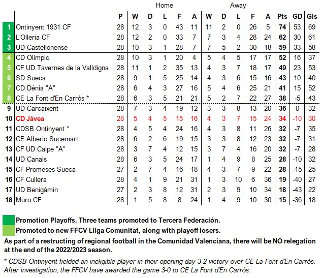 In October 2022, the 55 clubs of the Regional Preferente voted to create a new regional tier – the Lliga Comunitat – which will become the highest division in the Comunidad Valenciana and will consist of two groups of 16 teams. It will begin next season – 2023-2024 – and will be the feeder division into the Tercera Federación, the bottom tier of the national pyramid system. The group winners would win automatic promotion whilst the second and third placed teams in each group would play-off for the remaining two spots. The bottom three in each group will be relegated to the Primera FFCV.