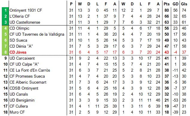CD Jávea lifted themselves into the TOP 8 with a comfortable 3-0 win at CE La Font d’en Carròs, their fourth successive victory in a run of six games without defeat, two goals from Carlos Bisquert building on an opening own goal. With UD Carcaixent losing at Muro CF, the rojiblancos now have a two point cushion to work with as they move into the final three games.