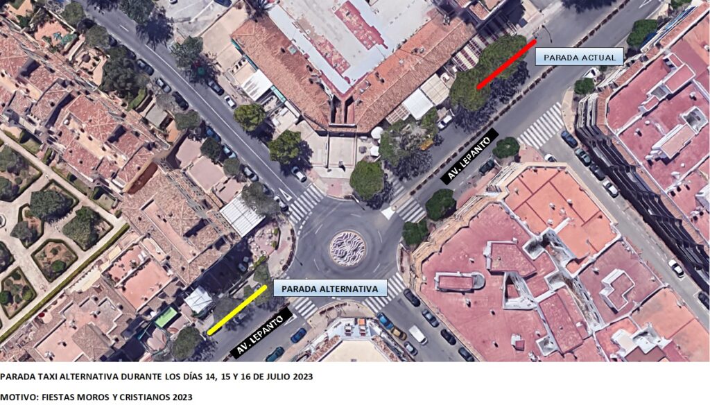 TAXI – The taxi rank normally located outside Chino Hong Kong will be relocated to the other side of the dolphin roundabout, outside Farmacia Salomé Martínez.