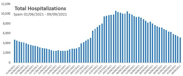 According to the latest report from the CCAES, there are 5,115 hospitalized due to COVID-19 across Spain, a drop of over 30% on two weeks ago, of which 1,258 have been admitted to ICU wards, a drop of just over 26% on two weeks ago. The percentage of beds in general wards occupied by patients suffering from COVID-19 is 4.31% whilst the percentage of beds in ICU wards occupied by COVID-19 patients is 13.73%, both lower than two weeks ago.