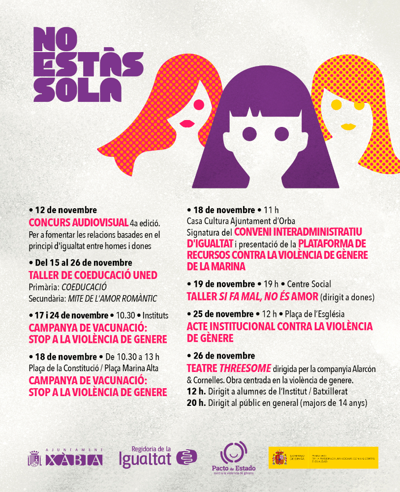 The Department of Equality in Xàbia, headed by councillor Montse Villaverde, has launched the campaign “NO ESTÁS SOLA” to raise awareness and make visible the mistreatment of women and commemorate the International Day for the Elimination of Violence against Women.