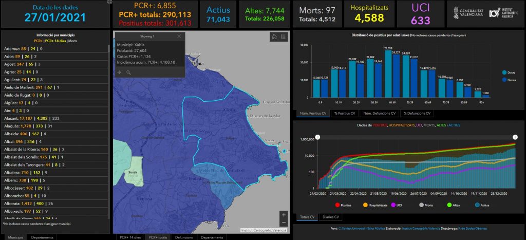 Xàbia has seen 73 new positive cases reported since the last update on Tuesday 26th January, taking the total to 1,134 positive cases found in Xàbia since the pandemic began.