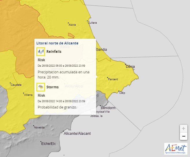 The state meteorological agency AEMET has activated YELLOW alert risk warning for the potential for heavy rain and storms from 6.00am tomorrow Friday 26th August which could affect many places throughout the Marina Alta region until midnight the same day.