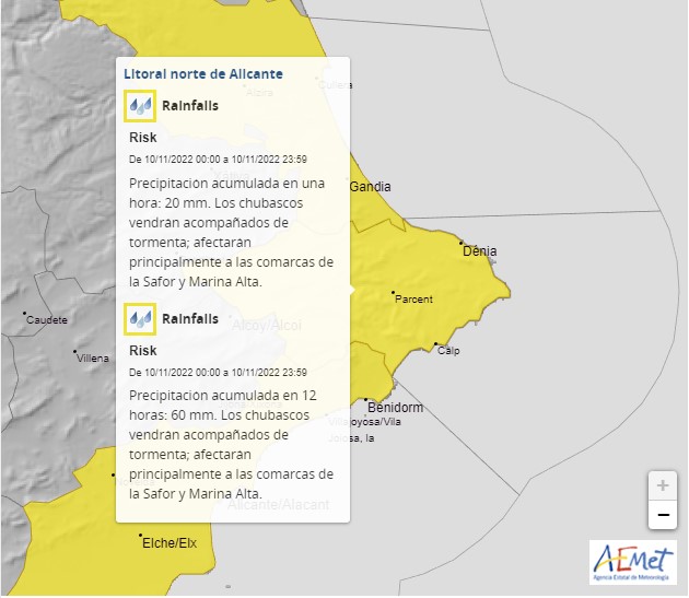 This risk is also valid for the rest of the coastal areas of Alicante (Benidorm, Villajoyosa, Alicante, Elx, Orihuela, Torrevieja, Novelda) and the region of La Safor (Gandía, Alzira, Cullera).