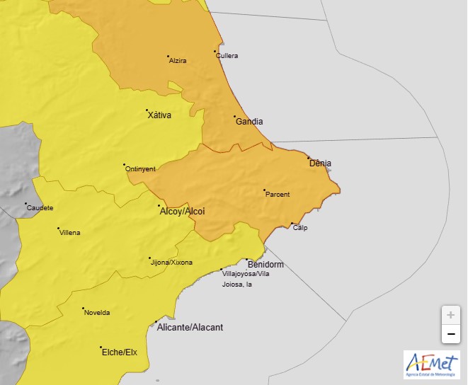 Note: The advisory is given for a wide area known as ‘Litoral Norte de Alicante’ – the Northern Coast of Alicante Province – which covers a wide area extending as far inland as Ontinyent and Alcoy as well as the mountains of the interior of the Marina Alta. Consequently, this warning might not affect us directly on the coast but might be more felt inland. Nevertheless, a warning is something that should be acknowledged and the necessary preparations made (see below).