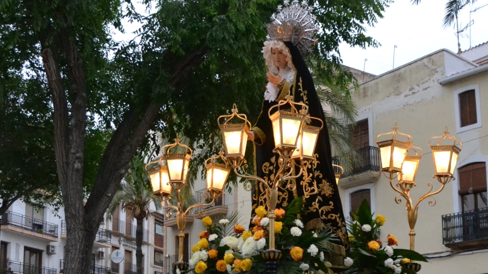 The first image being carried is that of La Dolorosa which used to be one of the most venerated images in Xàbia. The first record of the image being registered in our town dates back to the second half of the 18th century and that the Bover family was its guardian for at least 200 years before it passed to Casa Bolufer through the marriage of Rafael Bover Albi to Joaquina Bertomeu Bolufer in the 1920s. The following decade, during the tragedy of the Spanish Civil War, the image was destroyed by Republican forces but not before the sculptor Juan Bautista Devesa Sapena “El Santeret” risked his life to make a mold of the face and the Bover family saved the crown, hiding it away in an animal pen. After the war, a new image, this image being carried today, was created and first revealed in the mid-1950s.