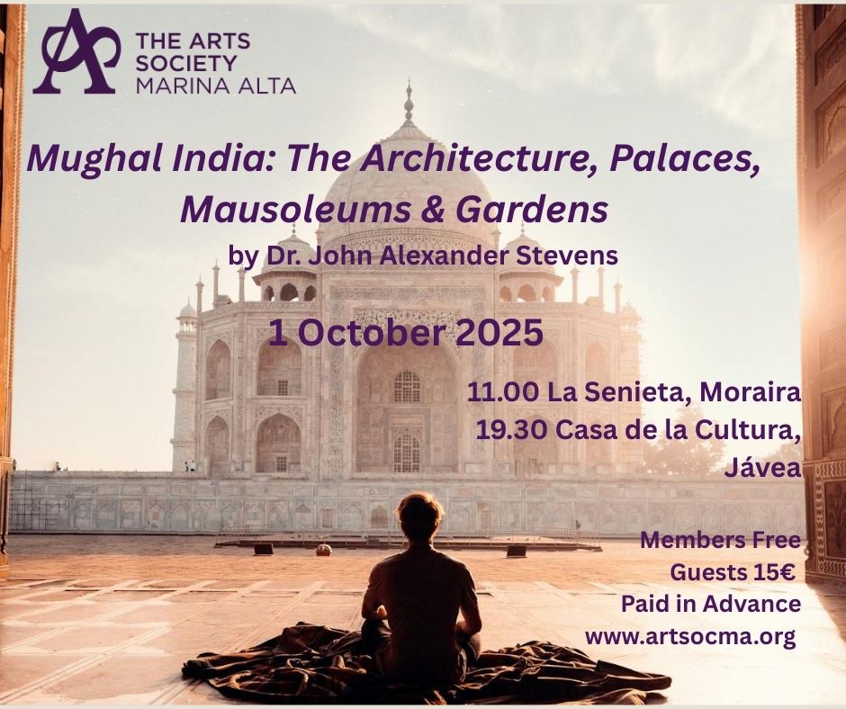 The Arts Society Marina Alta are absolutely delighted to announce details of their first autumn 2025 lecture ‘The Architecture, Palace & Gardens of Mughal India’, presented by Dr. John Alexander Stevens