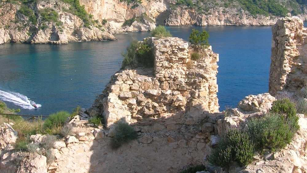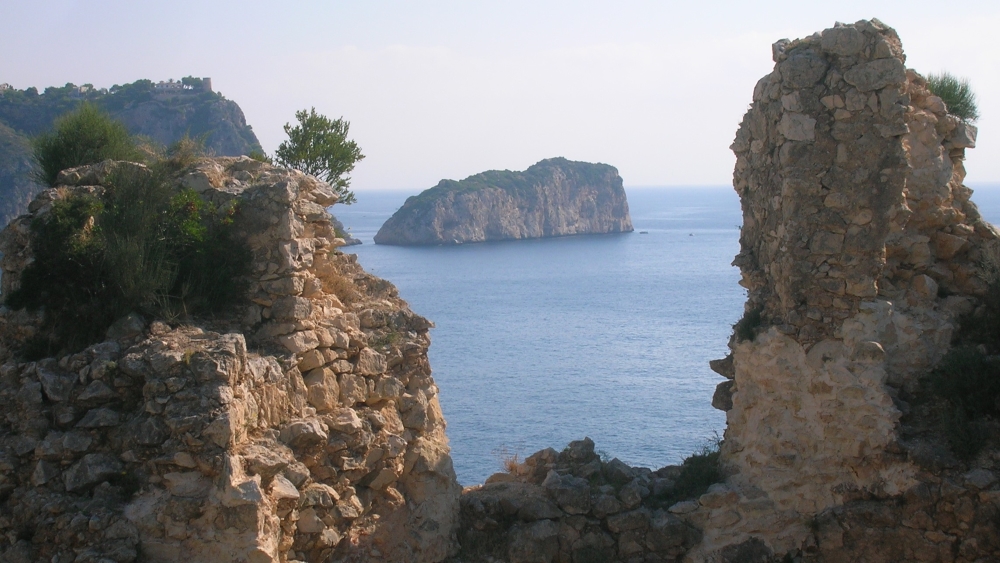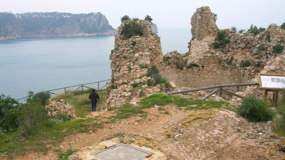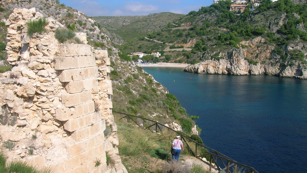 The ruins can only be accessed on foot. From Cala de la Granadella, the official trail PR-CV 354, well-marked by regular signposts, climbs 1.6 kilometres to the site. The route is graded medium and is not for the faint-hearted: at times it clings to the cliff edge and negotiates short rock scrambles where anchored chains offer security and help you pull yourself up. It winds through fragrant Mediterranean scrub and umbrella pines, following the cliff contours until the ruins suddenly appear, crouched above the sea. From the headland the panorama is exceptional, north over the bay’s crystalline waters, east toward Cabo de la Nao, and beyond that the vast blue of the Mediterranean.