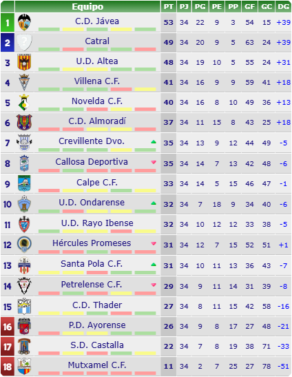 The following season, CD Jávea achieved the highest ever position in the Spanish pyramid system, finishing third in Group 6 (Sur) of the Tercera División, one point behind CD Dénia. However, the rojiblancos had led the table for much of the opening half of the season, enjoying a run of just two defeats in 18 games before a post-Christmas dip in form saw the club claim just four wins in 12 games and drop to fourth. A late season rally lifted the club into second spot with two games remaining, but a 1-1 draw at UD Canals and a 1-0 win for CD Dénia at home to UD Horadada in the penultimate round of games allowed the dianense side to reclaim second spot and then secure it with a 1-0 win away at L’Olleria CF in the final game of the season to win a place in the play-offs (they finished third in Group C1 and failed to win promotion; they would be relegated back into the regionals the following season).
