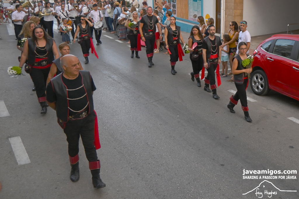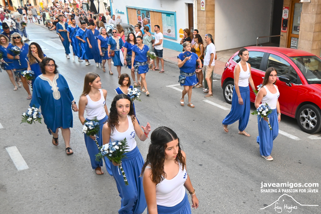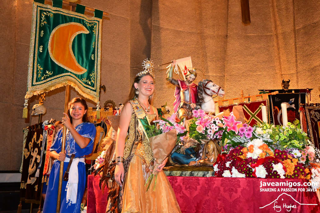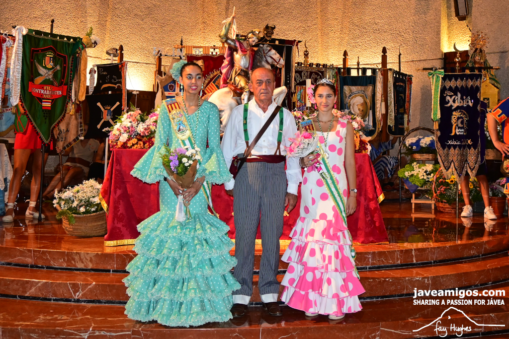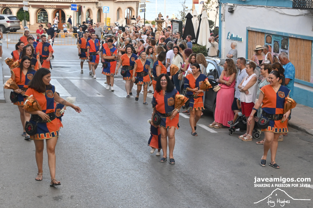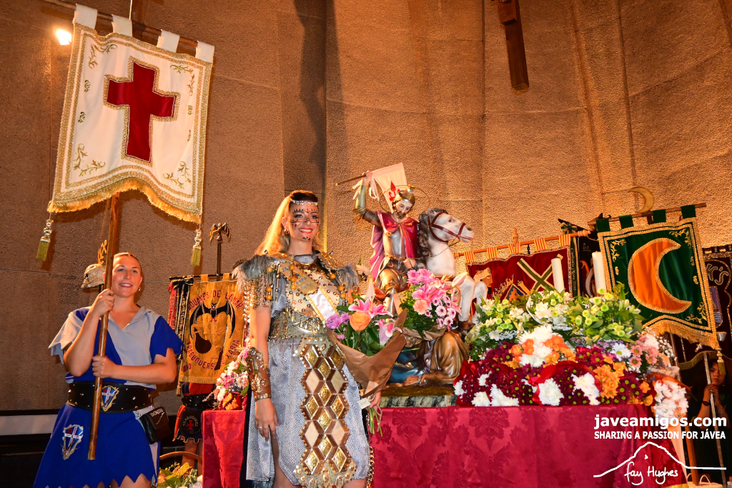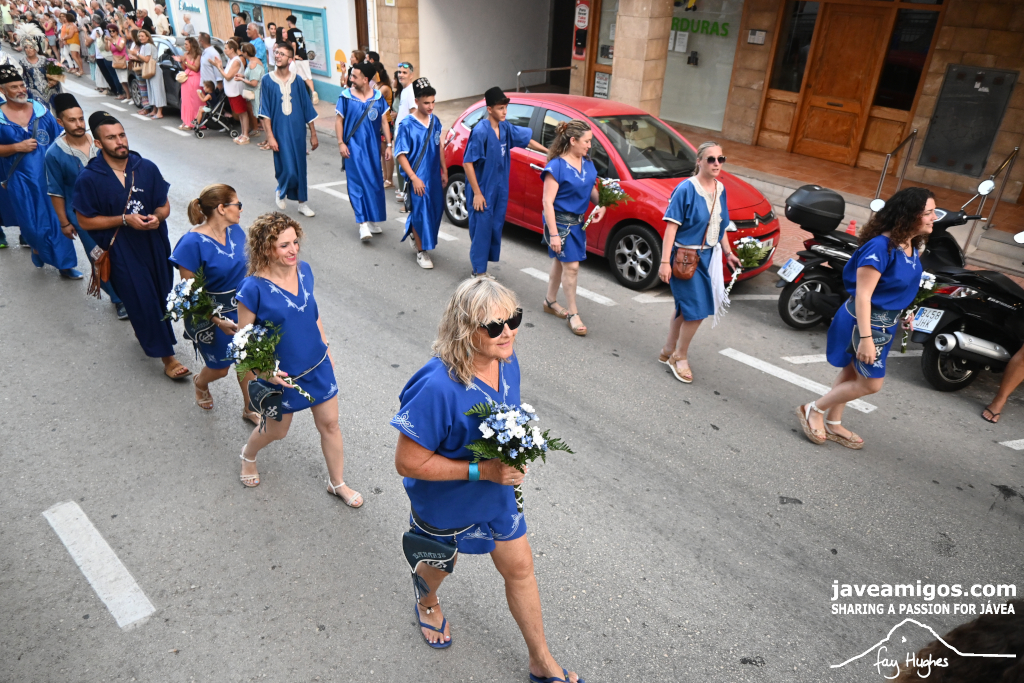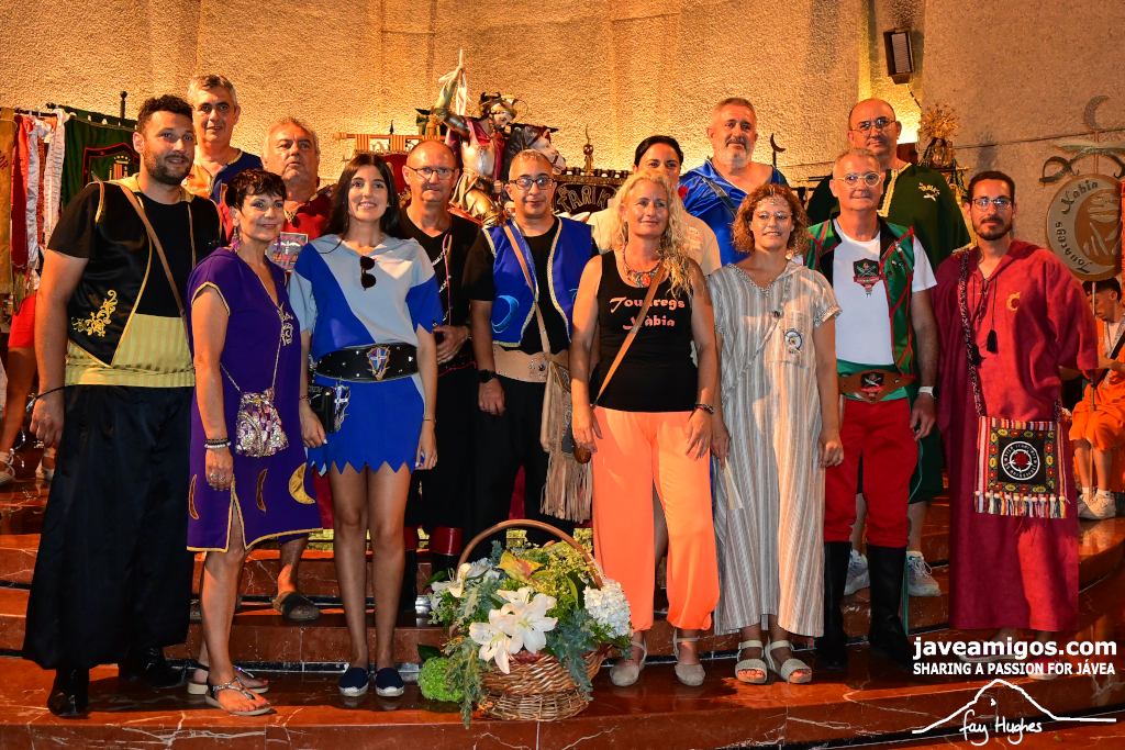 The offering of flower to Sant Jaume represents the beginning of the grand finale to the Moors & Christians fiesta in Xàbia, the last few days intensifying in colour and noise that will culminate in the grand gala parade of the Filà Capitana BAHARIS on Sunday evening.