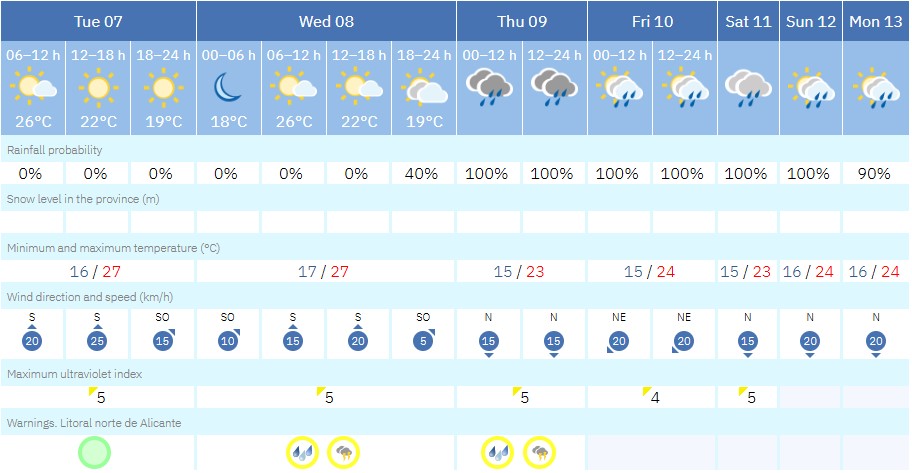 The Spanish state weather agency AEMET has issued a yellow-level alert for the potential for heavy rain and thunderstorms across the Marina Alta. The warning comes into effect on Wednesday evening and will remain active at least until midday on Thursday 9th October 9th, a bank holiday in the Comunidad Valenciana. Forecasters say there’s a 40–70% chance of intense rainfall, with showers capable of dumping up to 30mm of rain in just one hour, and as much as 60mm over 12 hours.
