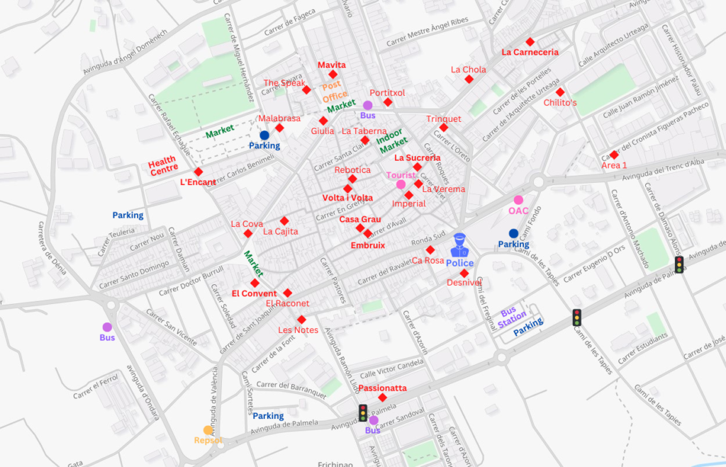 There are two large municipally-owned underground car-parks in Plaza de la Constitución (500 spaces) and Plaza del Portal del Clot (300 spaces), both of which are just a few minutes’ walk from the centre of the village. The rate for 2023 is 0.62 euros / hour but some restaurants and shops will offer vouchers for free or discounted parking. There is a third free car-park next to the bus station in Avenida Palmela which is about five-minute walk uphill to the centre.