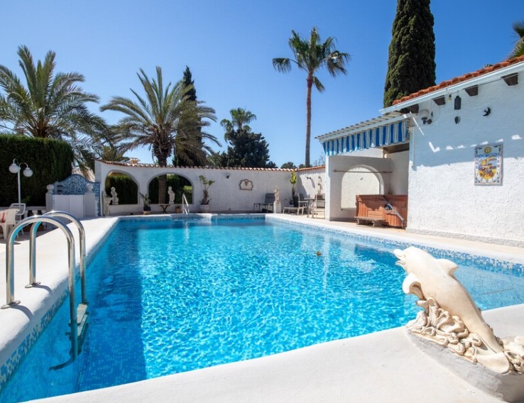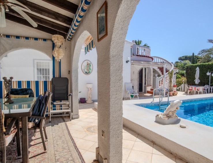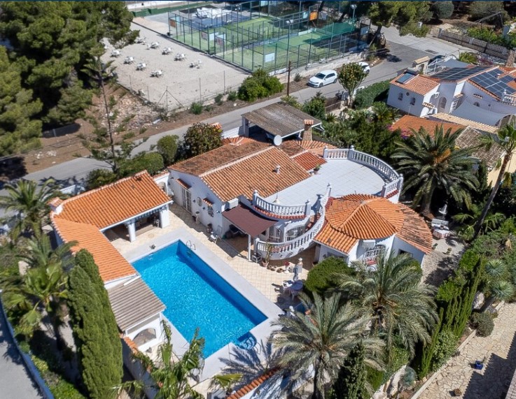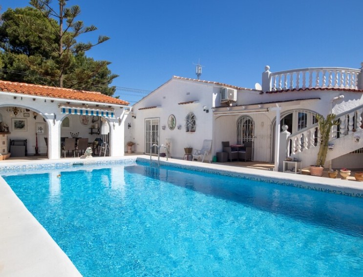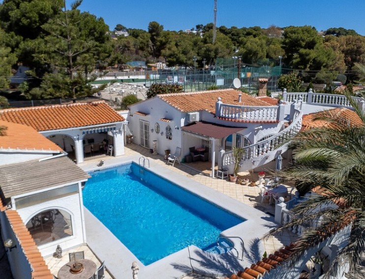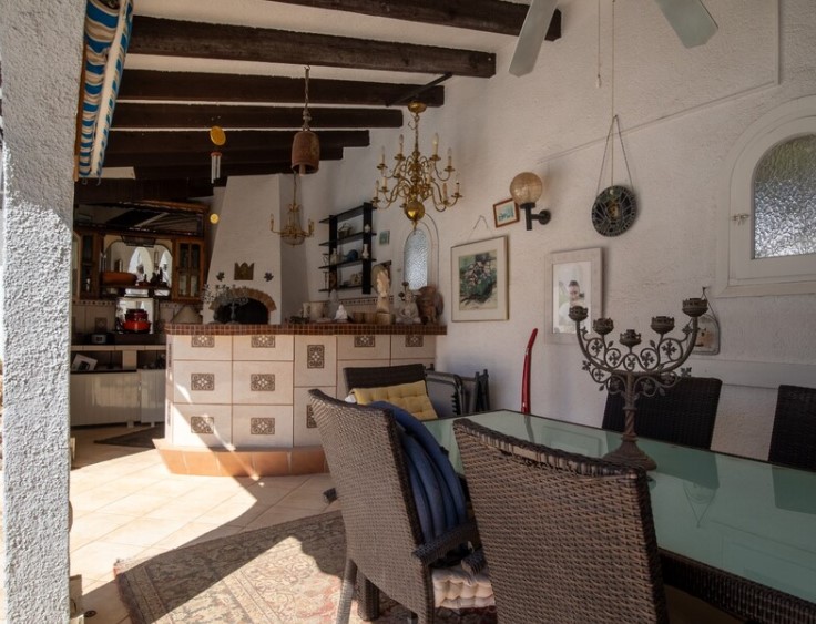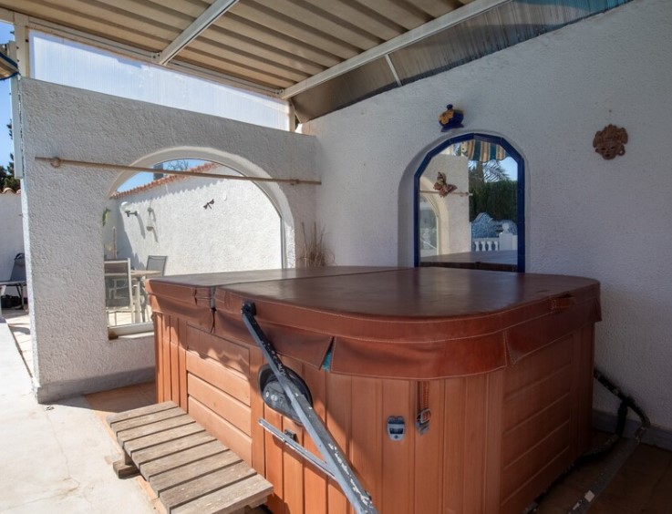 This spacious 3 bedroom villa is in the peaceful urbanisation of Balcón al Mar, Javea. This single level villa boasts modern conveniences and a pleasant outdoor area. The villa features a well-maintained interior with double-glazed windows. Inside, find three bedrooms and three bathrooms, all spacious and well-kept. The fully insulated property offers heating options with both gas and electric, ensuring year-round comfort. Air conditioning units are installed in every room. Outside, enjoy the generous plot, flat and south-facing. The highlight of the outdoor space is the inviting 10x5m heated pool, accompanied by a relaxing jacuzzi. There is a fully equipped outdoor BBQ area, complete with a grill, bar, fridge, and covered dining space. Additionally, a convenient cold/warm water shower is available. For sea views, ascend to the roof terrace. For accessibility, this property has minimal stairs. It’s also in a great location, just a 2 minute walk to a supermarket, or just 10 minutes drive to either the Arenal or Granadella beaches.