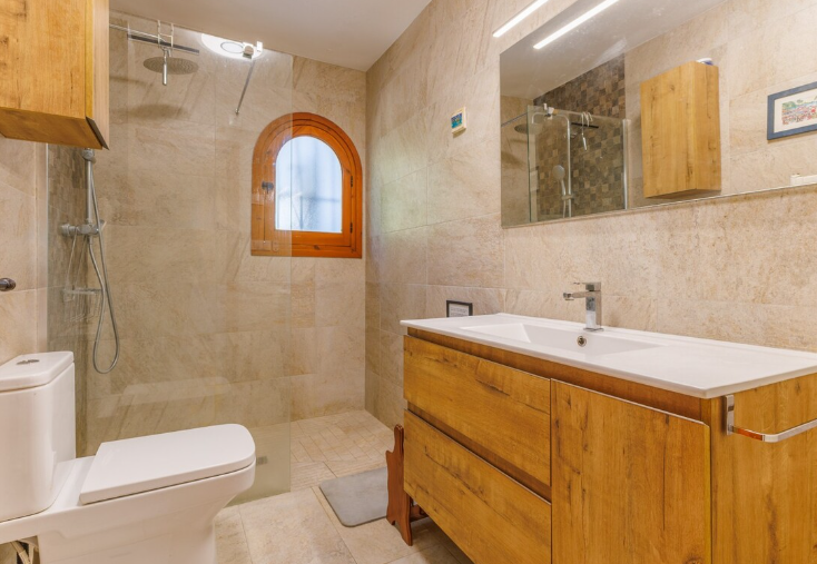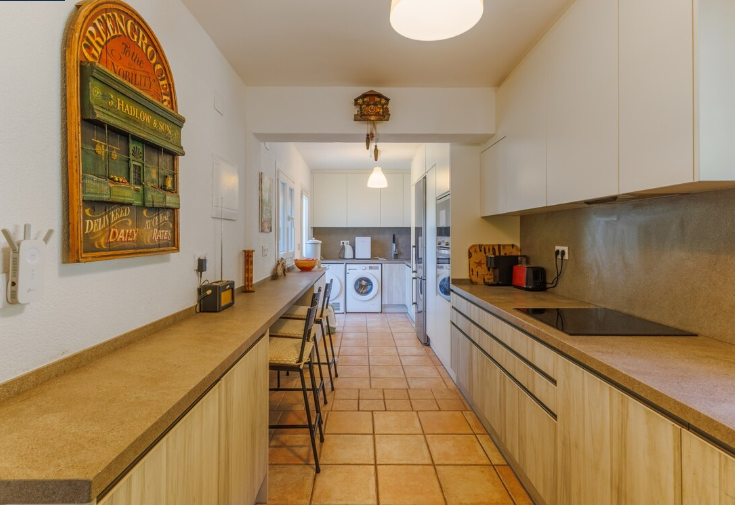 The main floor features a spacious living room that flows into a glazed naya currently used as a dining area, creating a light, sociable space that opens onto a large terrace with far reaching views. A modern separate kitchen sits alongside one bedroom and a bathroom. On the lower level, two further bedrooms share a bathroom. All bedrooms include fitted wardrobes, hot and cold air conditioning and ceiling fans for year round comfort.