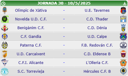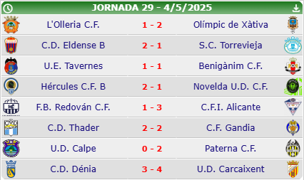 UE Tavernes and Hércules CF ‘B’ moved to joint top of the table with just one game to go in the regular season after Novelda UD CF’s six-week spell in the automatic promotion spot came to an end after their 1-2 defeat in Alicante, the third defeat in four games. Just three points separates the top five whist Olímpic de Xàtiva have an outside chance of a play-off spot if they beat UE Tavernes.