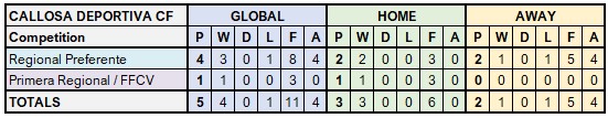 Callosa Deportiva have the fifth best home record in the group with 7 wins from 14 games and just one defeat, a 0-2 reverse against Novelda CF back in late February. The average points haul per match on home soil is 1.9.