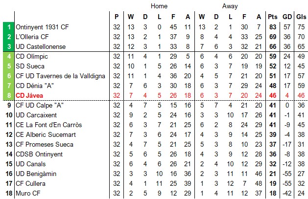 The win consolidates CD Jávea’s position in the TOP 8, five points ahead of UD Carcaixent, UD Calpe and CE La Font d’En Carròs, with two games to play. Next weekend, the rojiblancos travel to Tavernes de la Valldigna and a point should confirm a place in next season’s inaugural Lliga Comunitat.
