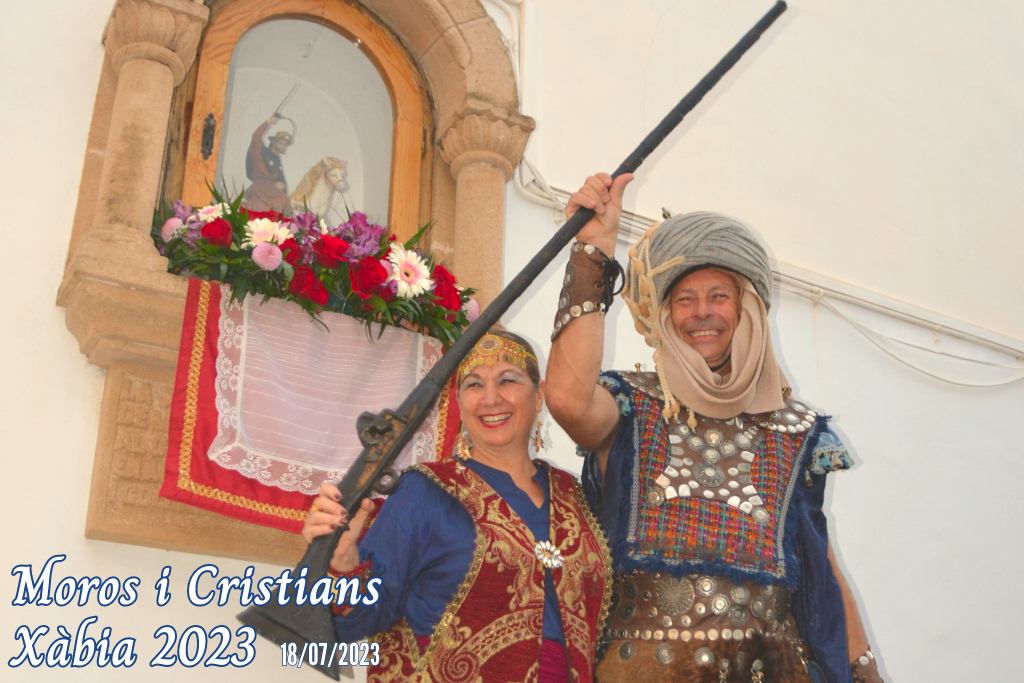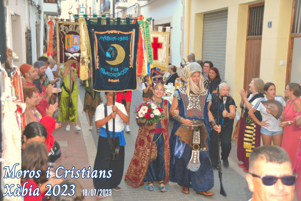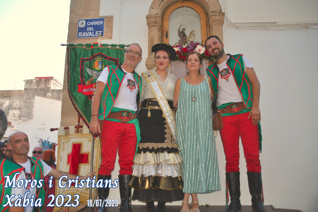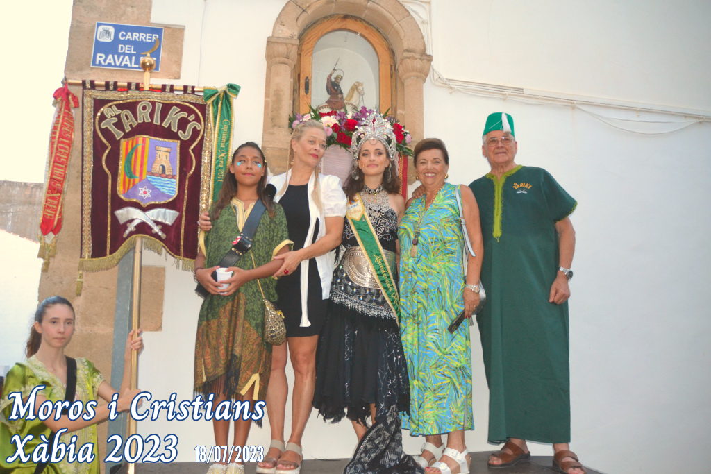 Standard bearers Indira Rosa Cardona (Moors) and Natalia Moya (Christians) were accompanied by the 2023 Captains Vicente Montaner and Merche Llidó from Filà Almoriscos in carrying their special bouquets to the niche where, to great applause from the troops of both sides as well as residents of the street and the general public, they made the traditional offering.