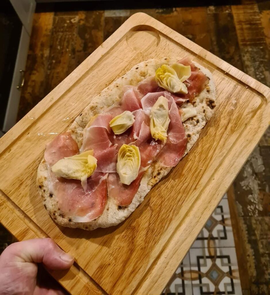 Flatbread: Mortadela and mozzarella cheese with pistachio pesto, Speck Taleggio and artichoke, Pancetta with honey and walnuts