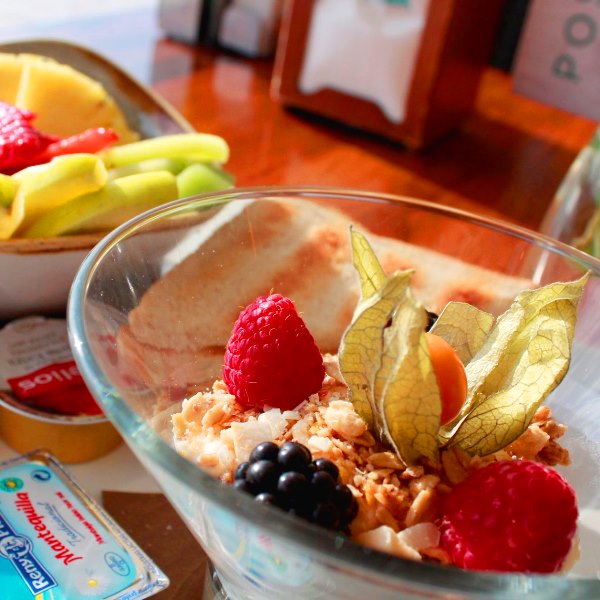 - Brownie with Vanilla Ice Cream, Hot Chocolate and Muesli