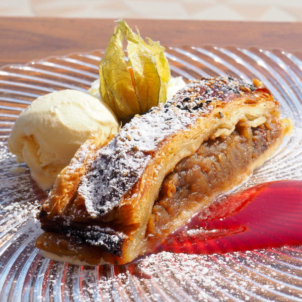 - Hot Apple Strudel, served with Vanilla Ice Cream