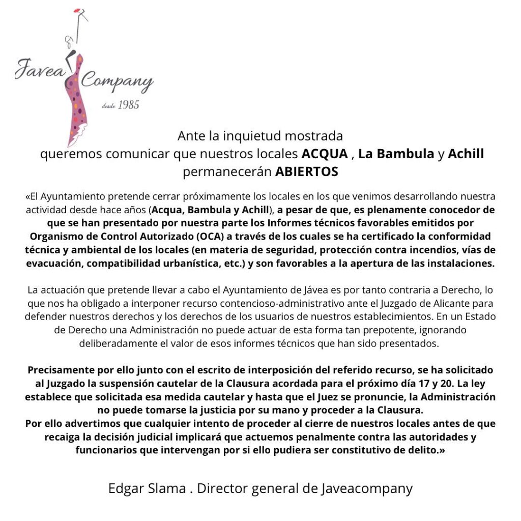 Edgar Slama of JaveaCompany has announced that he is taking the closure of his premises to the Contentious-Administrative Court