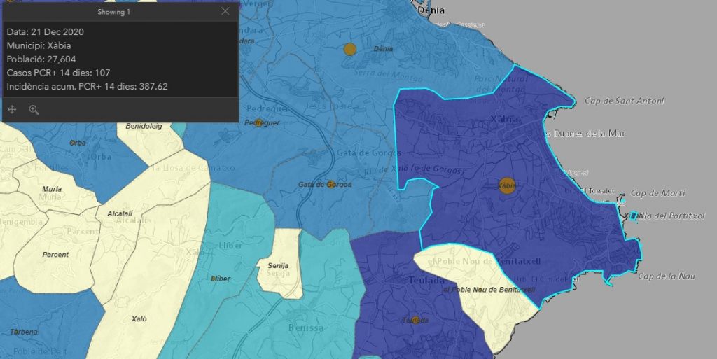 Xàbia has recorded 44 new infections confirmed by PCR test since the last update with the total number of infections rising to 373 since the crisis began. The 14-day cumulative rate (IA)1 has risen substantially, now standing at 387.62 new infections per 100,000 inhabitants, a rise of more than 40% over the weekend, and significantly higher than the national figure. Thankfully, the death toll remains at 3.