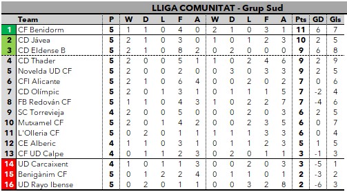 Benidorm maintain top spot after a goalless draw with Jávea in Jornada 5 of the Lliga Comunitat Grup Sud, as weather forced the postponement of matches at Calpe and Carcaixent, while Mutxamel, Olímpic, and L’Olleria all secured important wins to tighten the race behind the leaders.