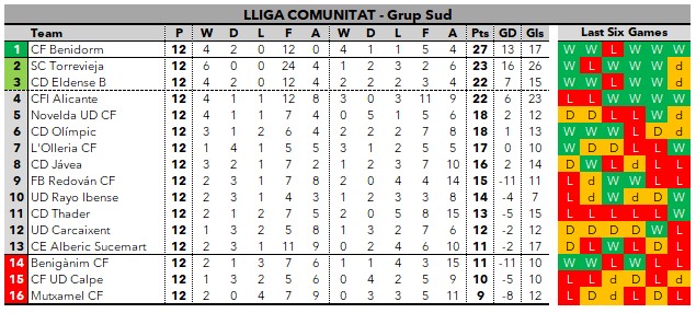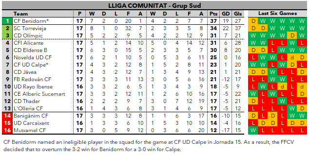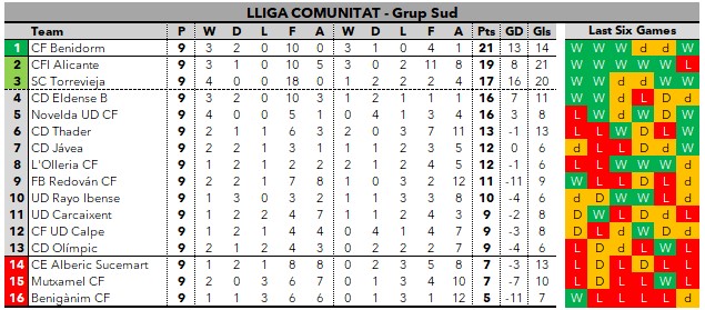 Only the two CHAMPIONS of each group – North and South – are automatically promoted whilst the teams which finish in second and third position in each group will play-off for the remaining place. The bottom three in each group are relegated to the LLIGA PRIMERA FFCV.
