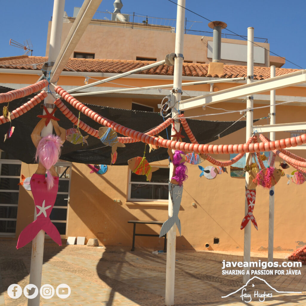 In the square of the Casa del Pescador, La Penyeta Roja has created a colourful reef of mermaids that seem to support the colonnade of the square. There are also fish and turtles made with cloth, cardboard, wool, string and beads, forming a fun decoration that is a true reflection of what the penya itself is. La Penyeta is always characterized by beautifying the environment in which it places its casal each year and contributing to the fiesta, not only with its participation as a group, but with its creativity.