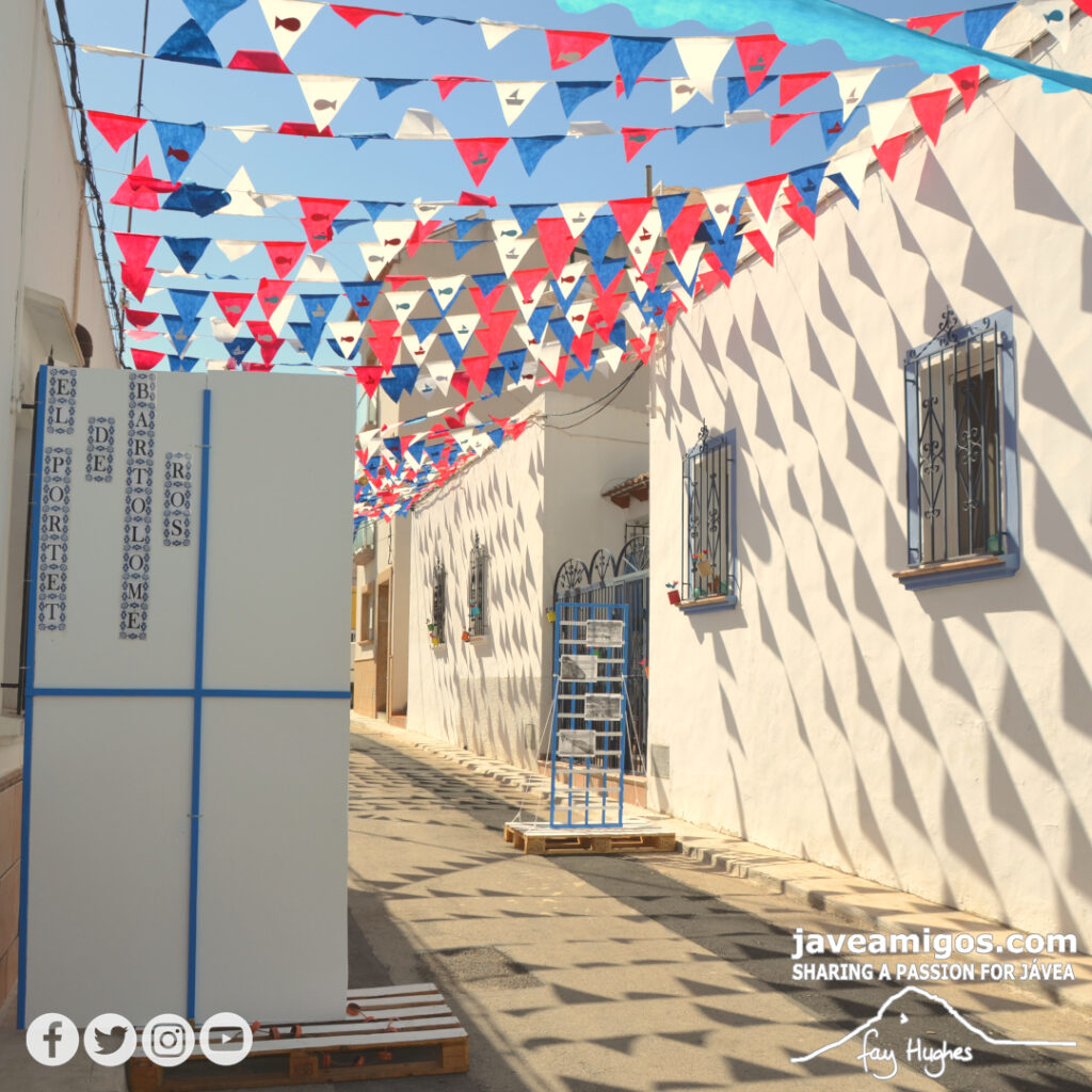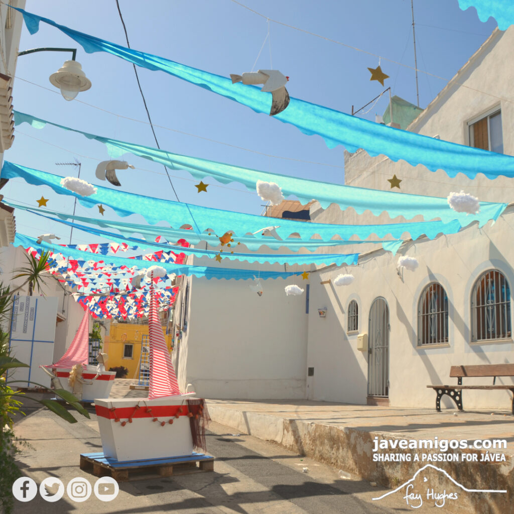 Calle Triana is the oldest of all the streets that have been decorated this year. It is once again the only one in all of Xàbia that dares to paint its long road, being its main hallmark. Blue banners with a letter M for Maria run through all the balconies and windows. It is not just any letter since, for its preparation, the residents have rescued the original template of some letters that were used to commemorate the coronation of the Virgin in the 1950s. A large anchor crowns the crossroads and maritime motifs and plants round off the composition. In addition to the four ornamental garlands of lights that the town hall places in this street, the residents have paid for four more and the lighting decoration of the centre.